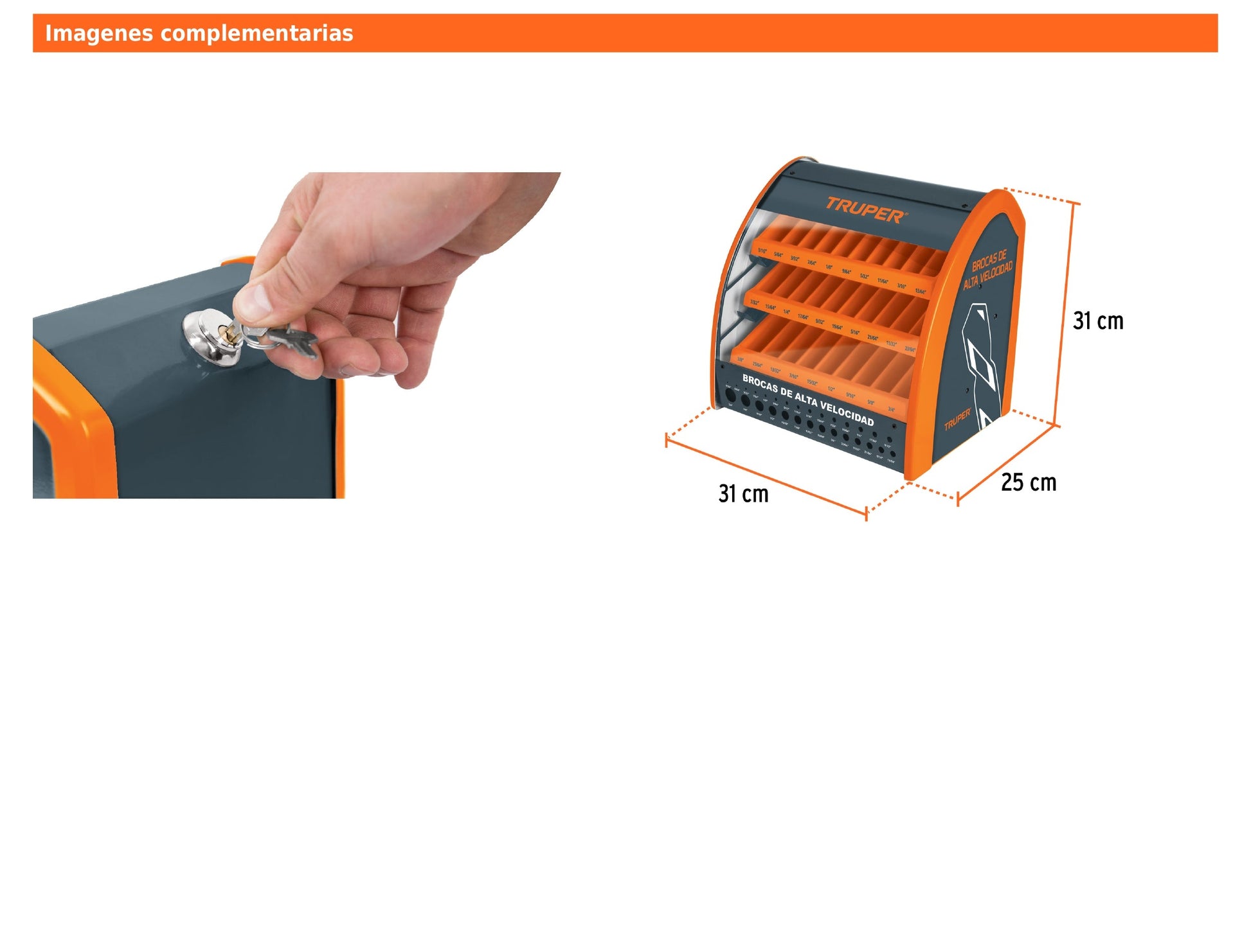 Integra 3 cajones con un total de 29 compartimentos, etiquetas identificadoras y cerradura para resguardar el contenido. No incluye brocas, lo que permite personalizar el surtido según tus necesidades.