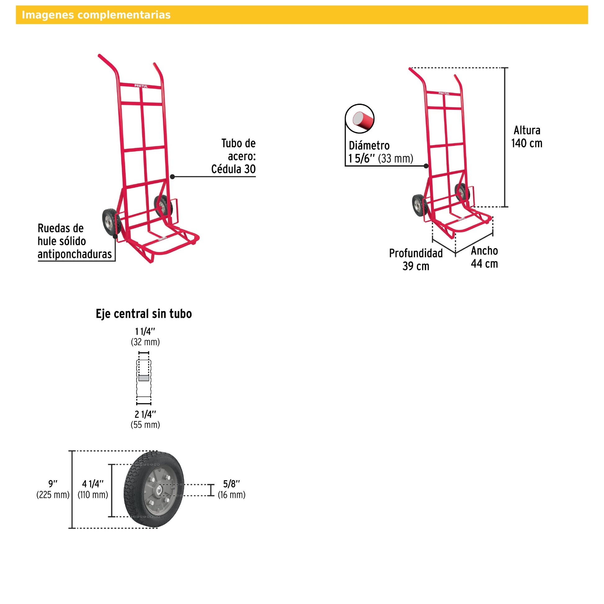 Diseñado para el manejo de cargas industriales, este diablo de carga soporta hasta 400 kg gracias a su estructura tubular de acero cédula 30 reforzada con tres soleras en la plataforma. Incorpora ruedas de hule sólido antiponchaduras con doble balero, ideales para desplazarse en superficies lisas. El eje central sin tubo permite un diseño más robusto y resistente. ompatible con ruedas de refacción Pretul® modelos RD-102, RD-92 y RD-82.