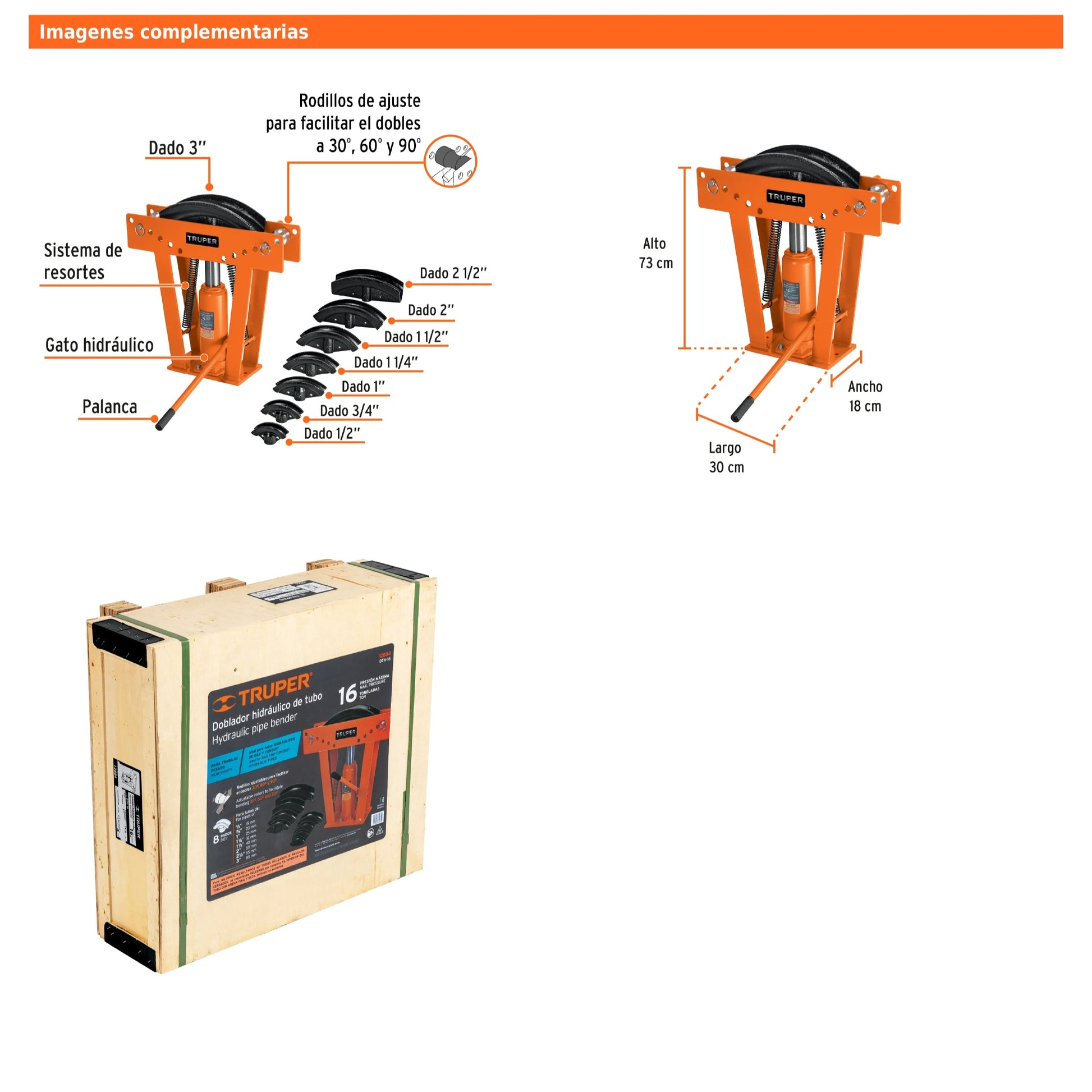 Este doblador hidráulico Truper de 16 toneladas está diseñado para trabajo pesado en tubos hidráulicos, de gas y conduit. Su estructura de acero y dados de hierro nodular brindan alta resistencia, mientras que el sistema de resortes mejora la retracción del cilindro.