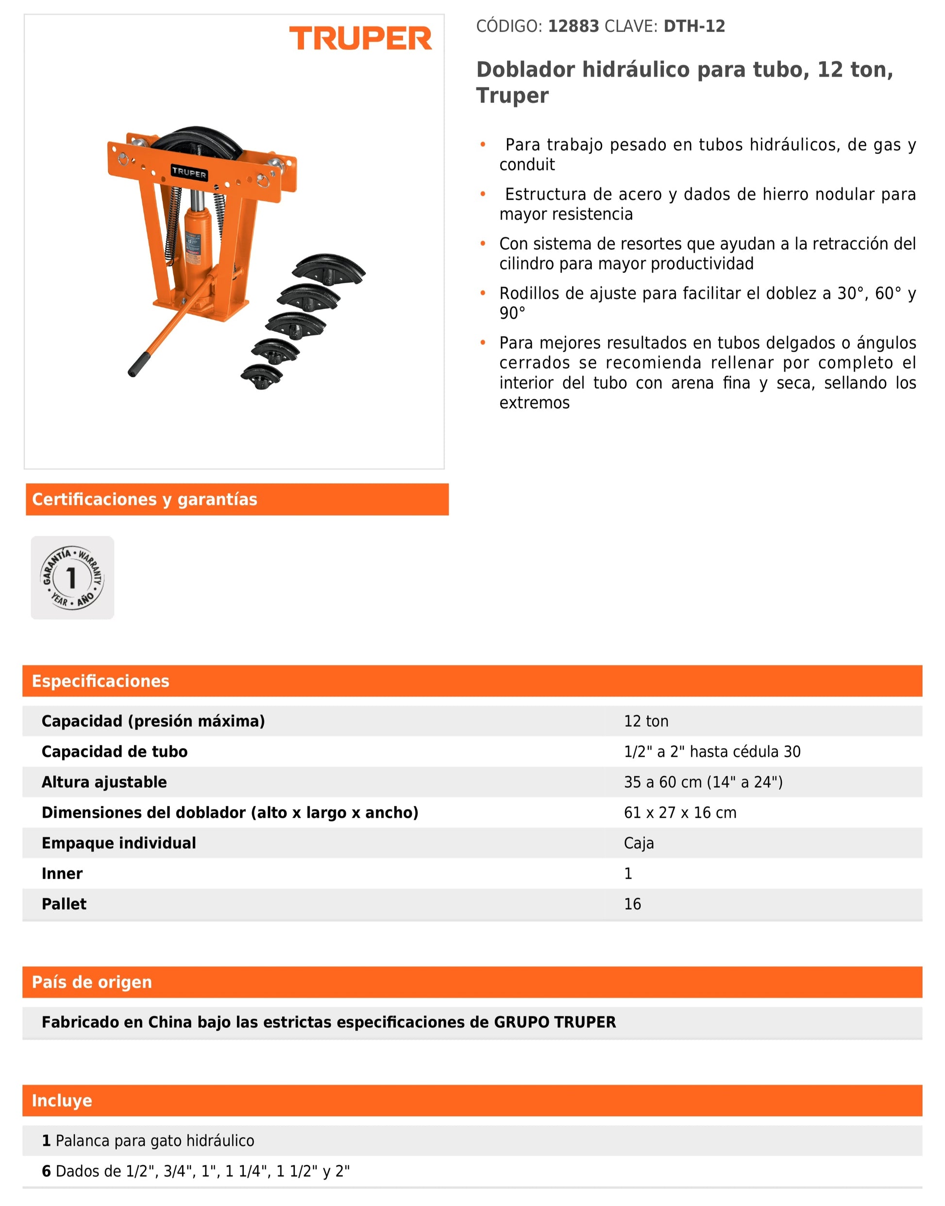 Este doblador hidráulico Truper de 12 toneladas está diseñado para trabajo pesado en tubos hidráulicos, de gas o conduit.