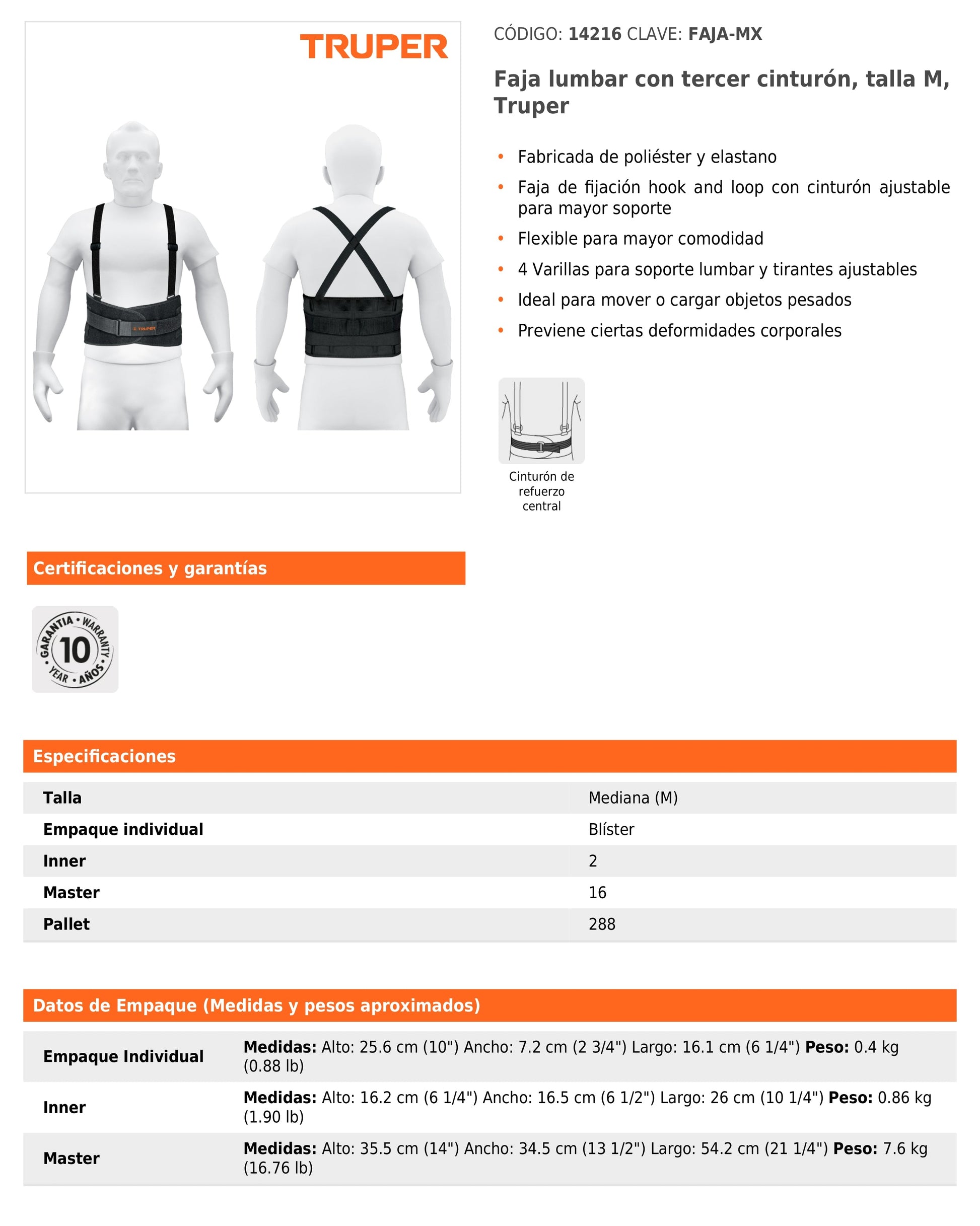 La faja lumbar Truper está diseñada para brindar soporte adicional durante actividades que implican levantar o mover objetos pesados.