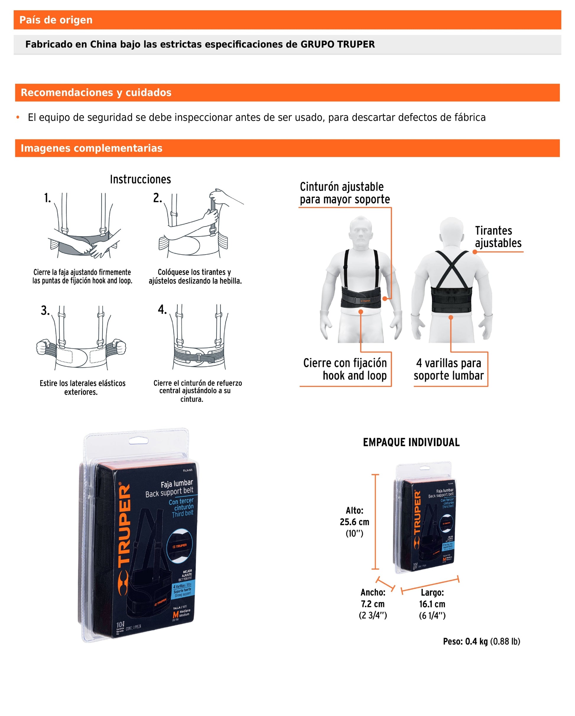 - Cinturón de fijación hook and loop con refuerzo central.