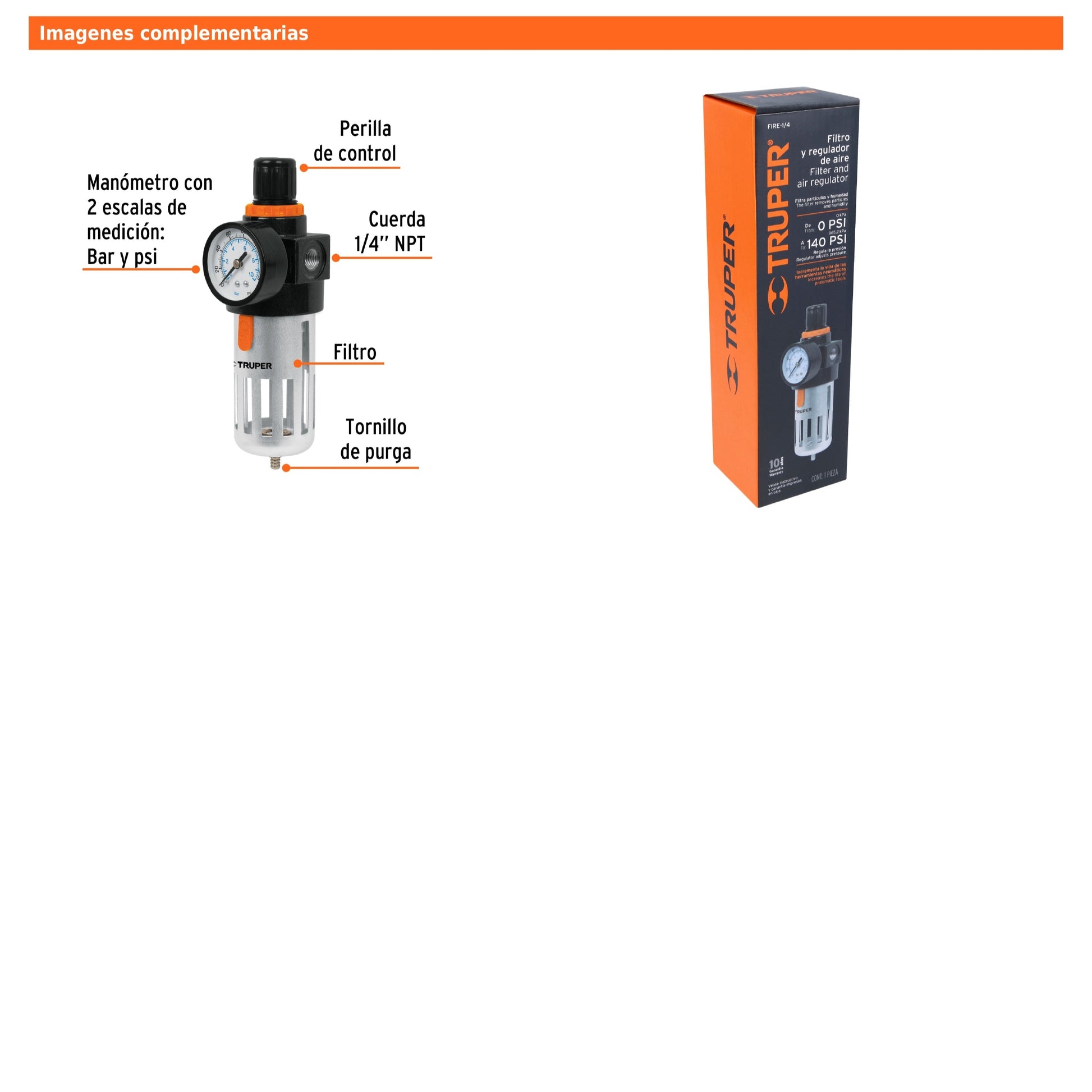 Este filtro y regulador Truper cuenta con manómetro integrado y cuerda de 1/4" NPT. Elimina contaminantes sólidos y líquidos del aire, ideal para pistolas para pintar u otras herramientas neumáticas.