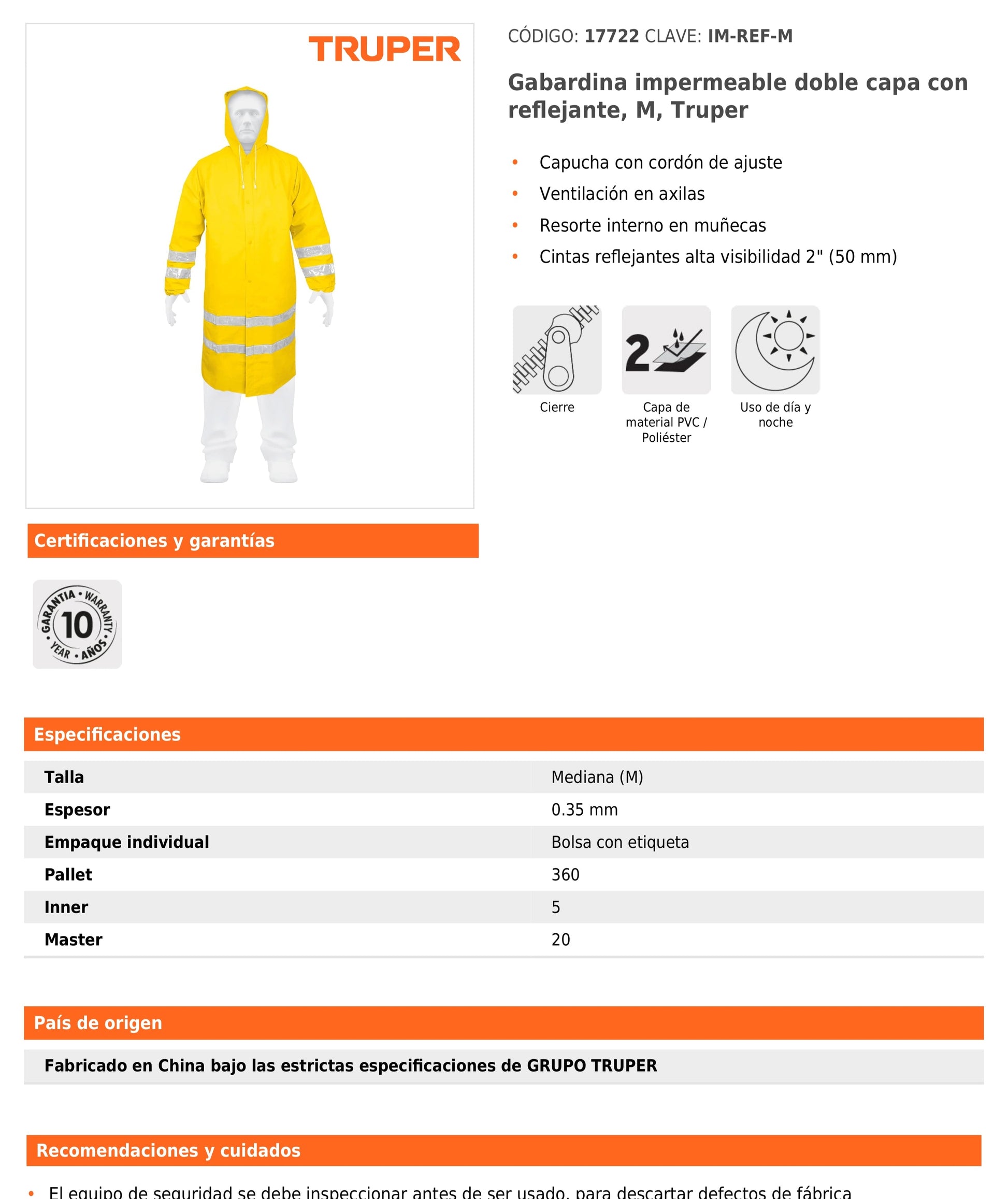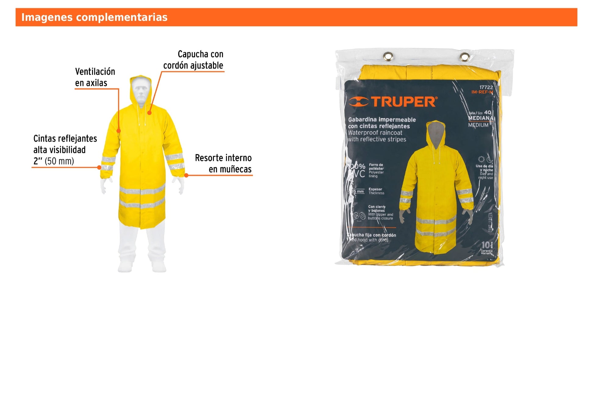 Esta gabardina impermeable Truper talla M está diseñada para ofrecer máxima protección y visibilidad en condiciones adversas. Fabricada en PVC/poliéster de doble capa con un espesor de 0.35 mm, incorpora capucha con cordón, ventilación en las axilas y resorte interno en las muñecas para mayor comodidad.