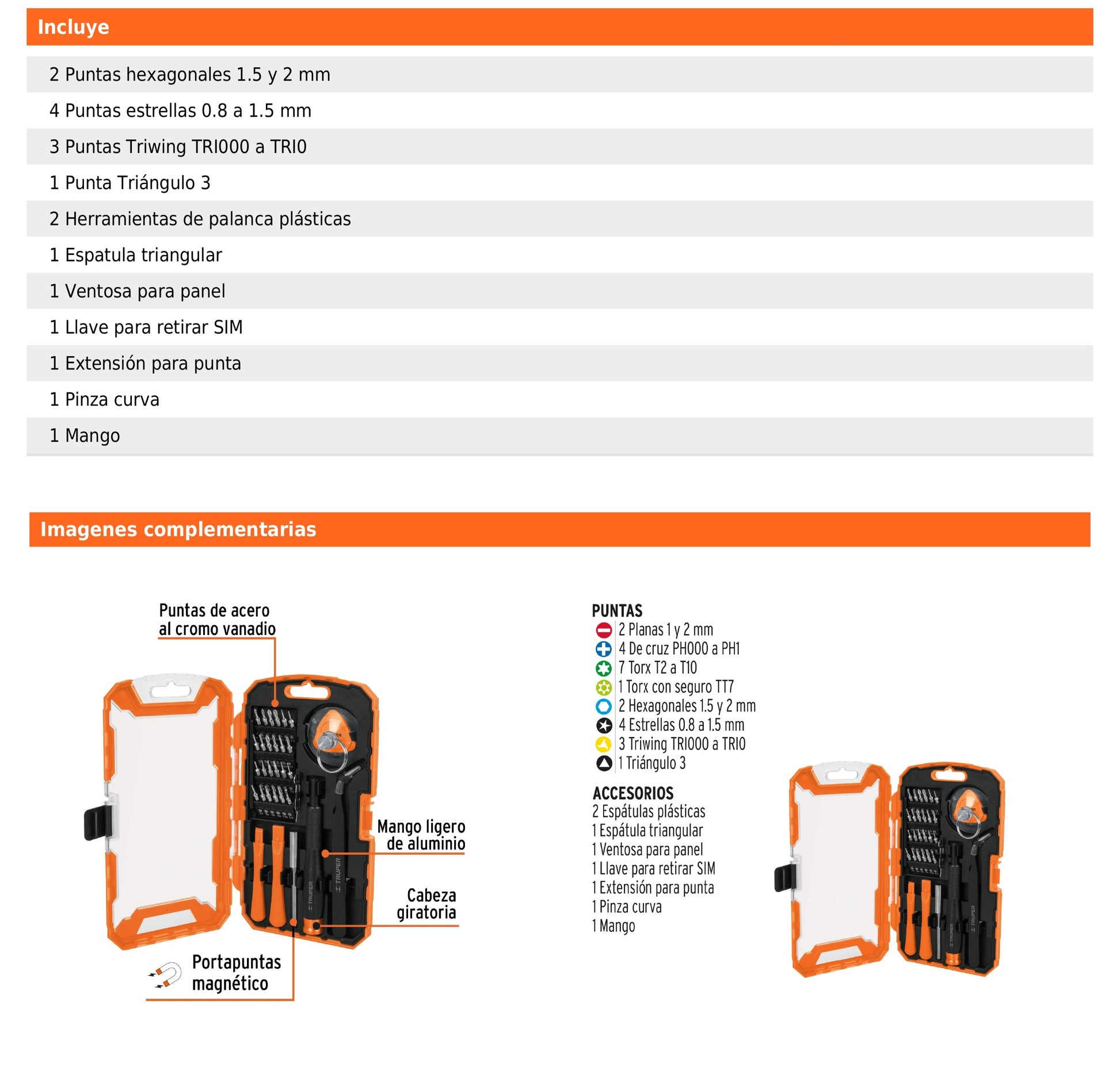 Incluye puntas de acero al cromo vanadio, mango ligero de aluminio con cabeza giratoria y portapuntas magnético. Viene en estuche organizador que protege las herramientas y facilita su transporte.