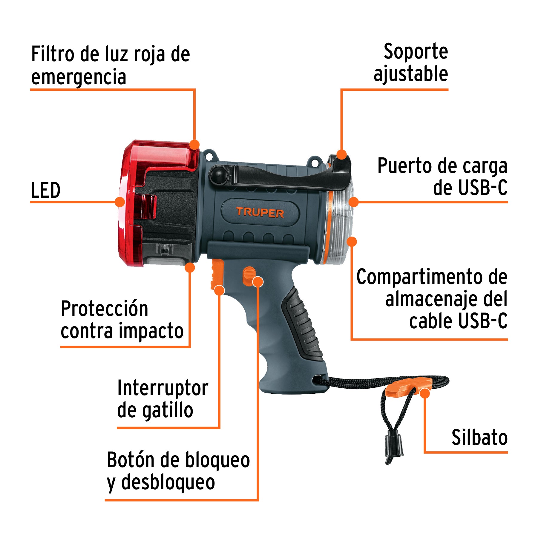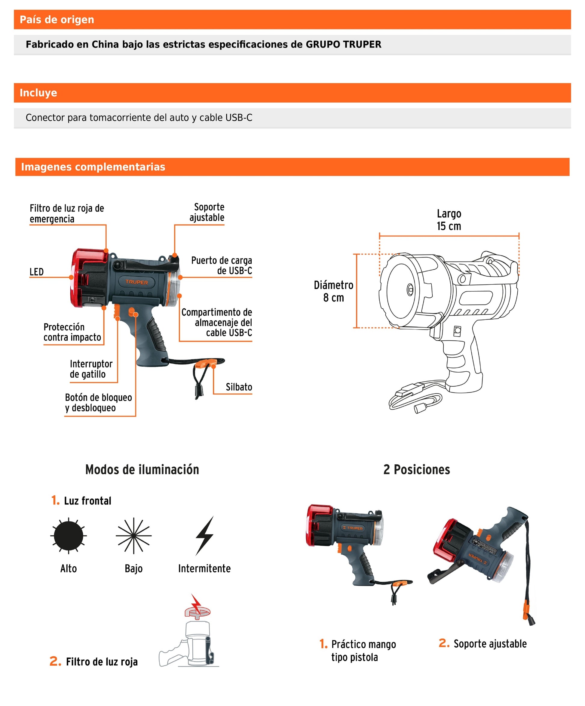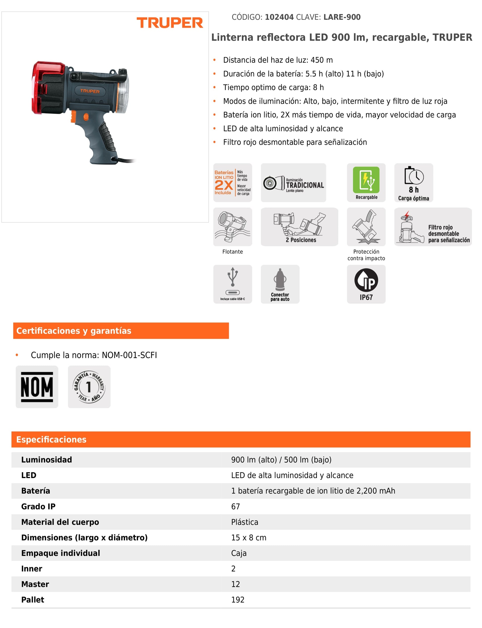La linterna reflectora Truper LARE-900 ofrece 900 lm de potencia y un haz de luz de hasta 450 m. Cuenta con batería recargable de ion-litio, 2 veces más duradera, y modos de iluminación alto, bajo, intermitente y luz roja.