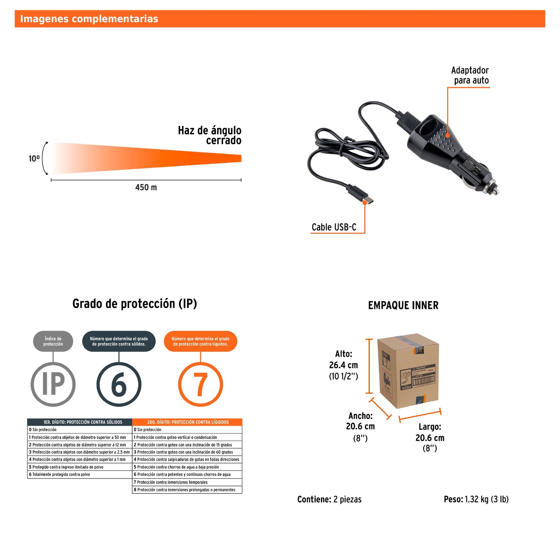 Su diseño resistente a impactos y grado IP67 la hace ideal para trabajos en exteriores, además incluye filtro rojo desmontable y cargador USB-C con adaptador para vehículo.