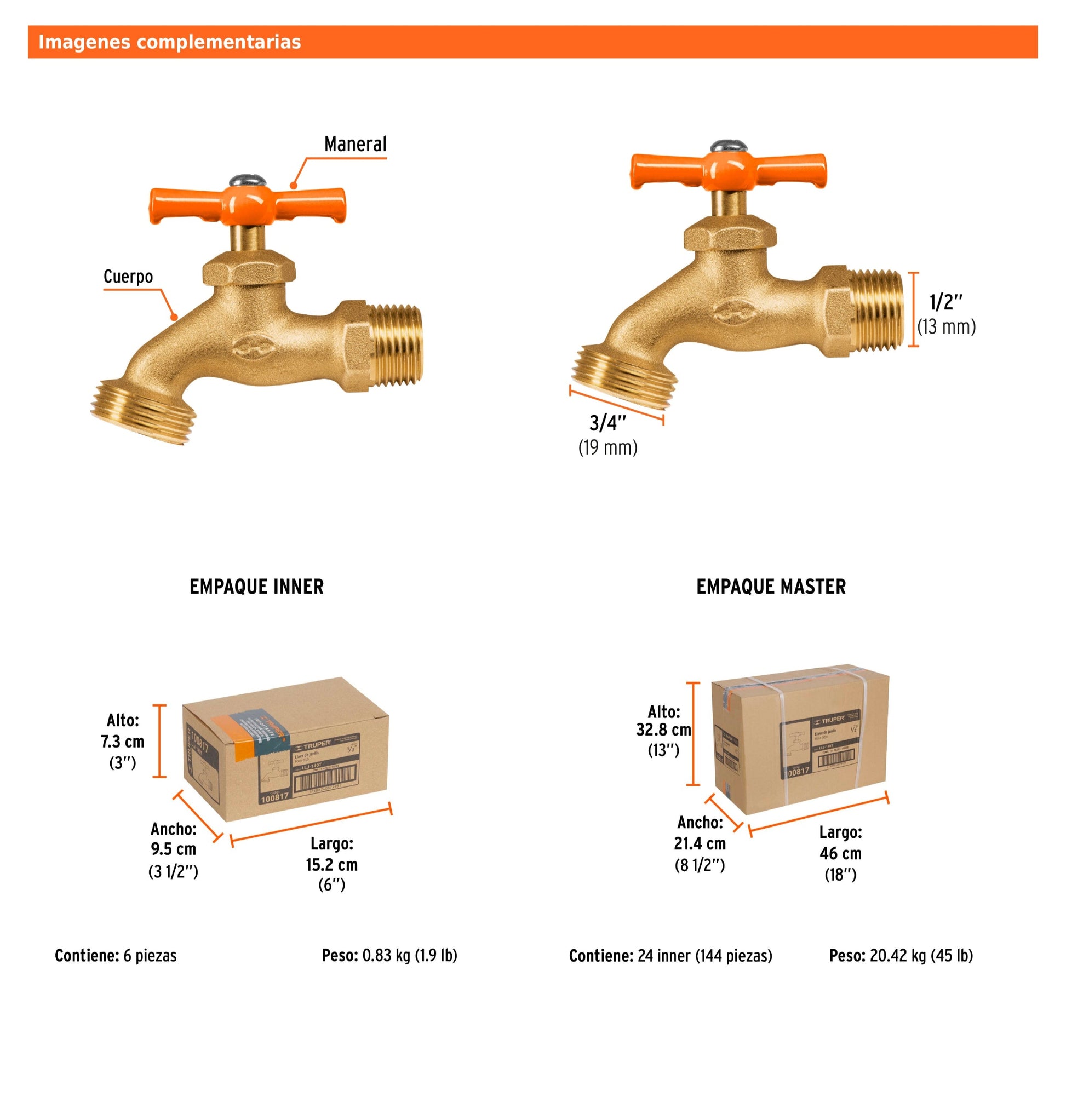 Esta llave de nariz Truper está fabricada en latón para máxima duración y resistencia a la intemperie. Cuenta con cierre de compresión y maneral metálico, lo que la hace ideal para jardines y tomas de agua.