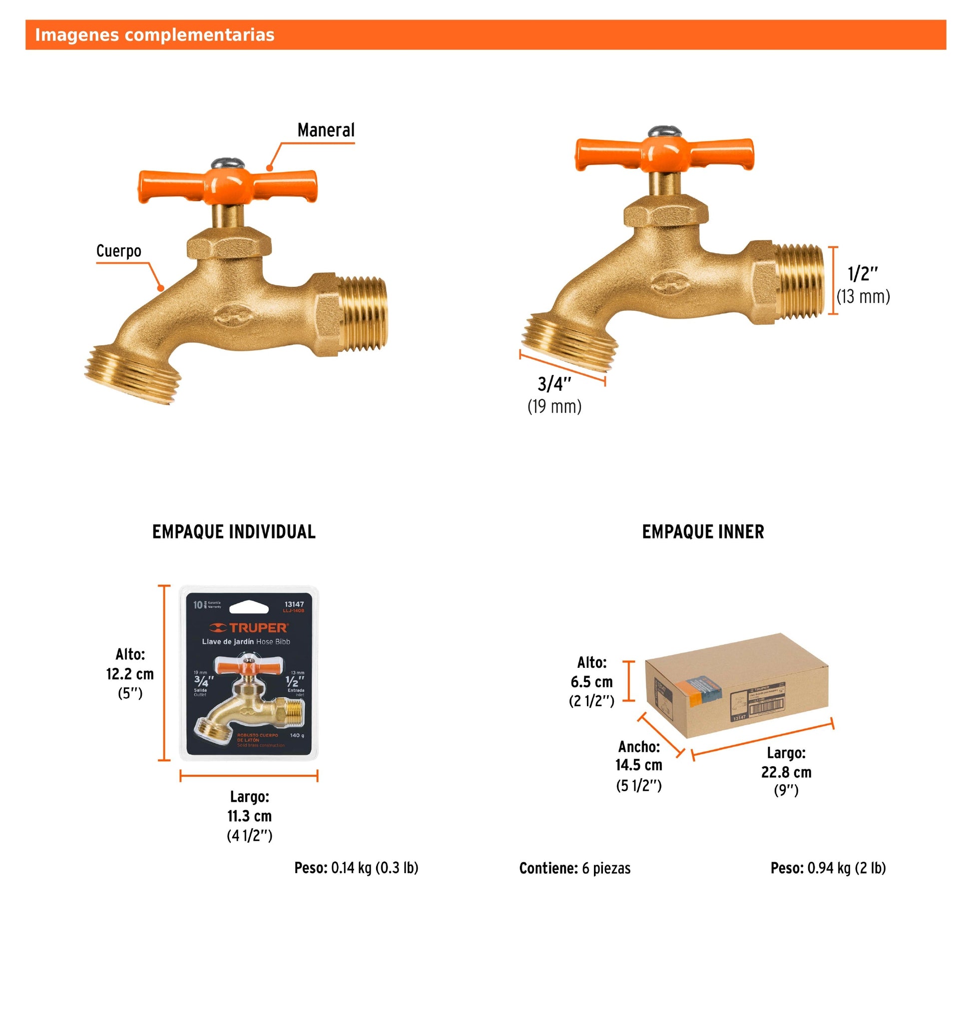 Su diseño incluye maneral metálico, cierre de compresión y conexiones estándar de entrada de 1/2" y salida de 3/4", ideal para jardines y tomas de agua.