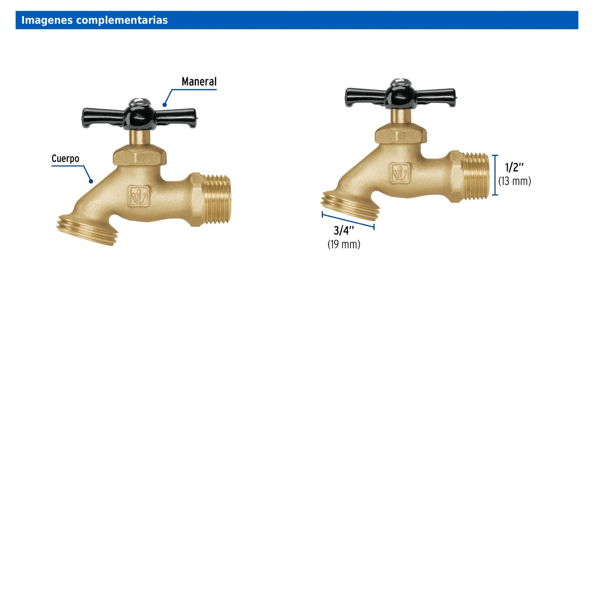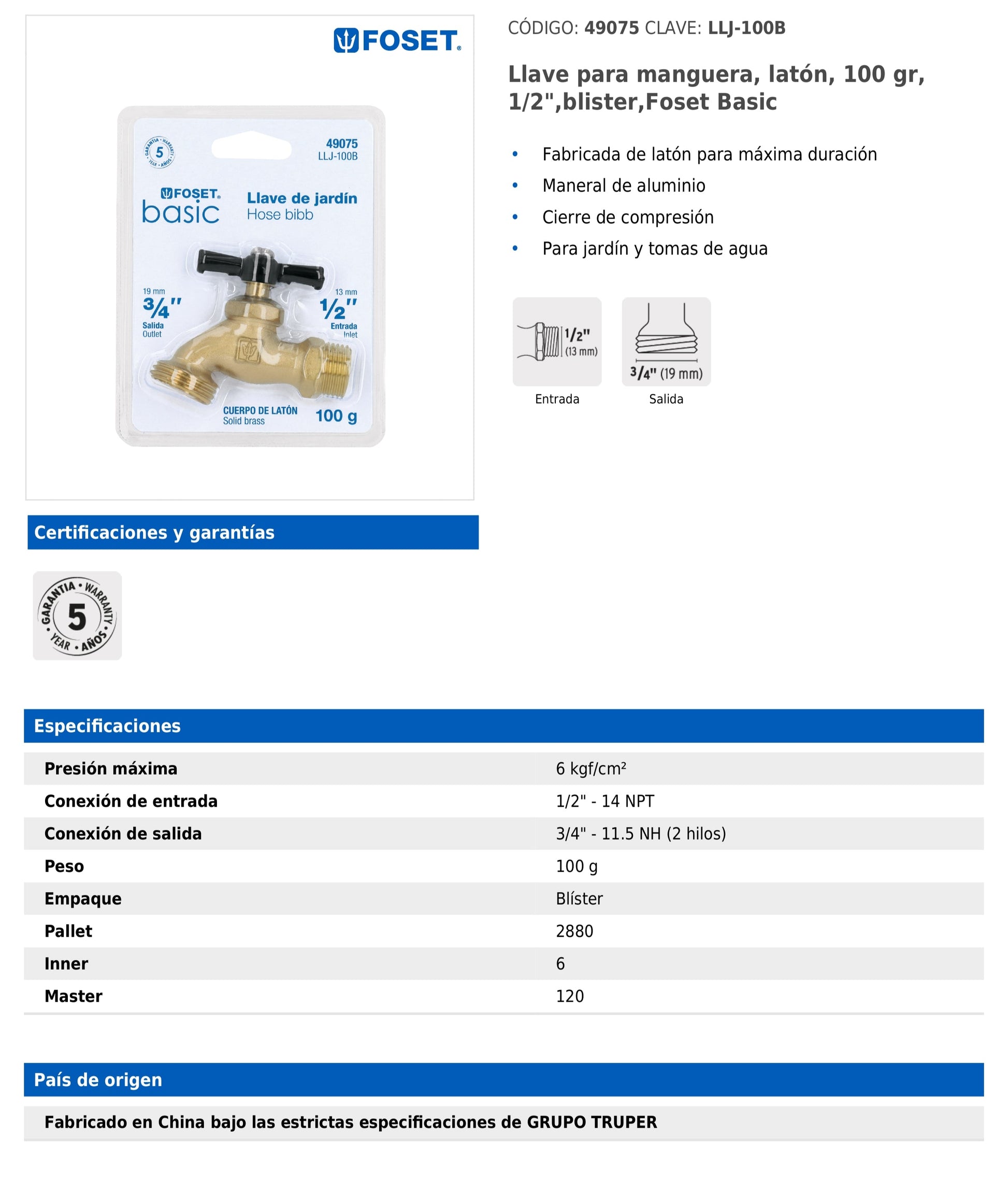 Con cuerpo de latón y maneral de aluminio, esta llave de 100 g ofrece alta resistencia a la corrosión y una larga vida útil. Su sistema de cierre de compresión asegura un control eficiente del agua, ideal para tomas exteriores y uso en jardín.