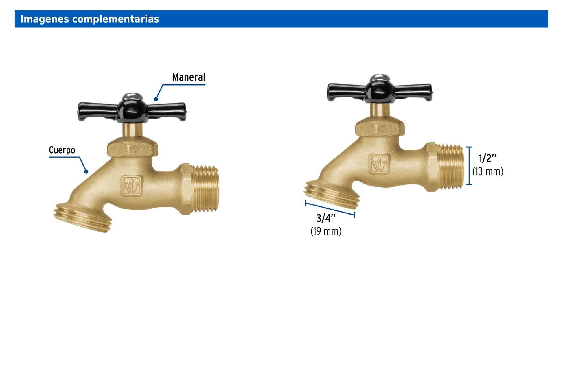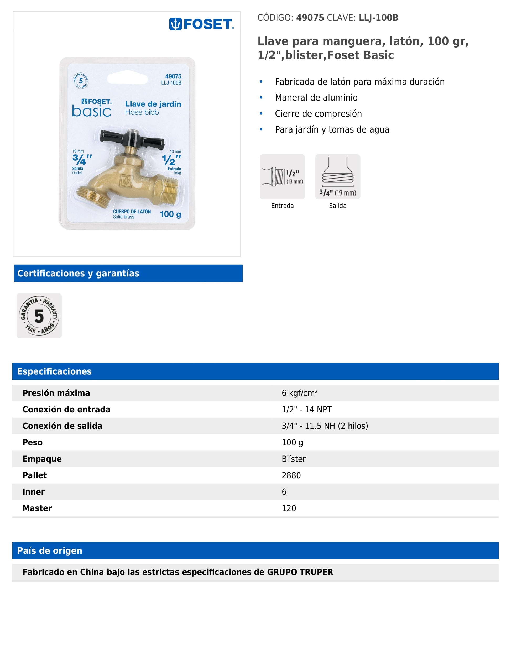 Fabricada totalmente en latón y con maneral de aluminio, esta llave de 100 g está diseñada para brindar máxima duración y resistencia a la corrosión. Ideal para tomas de agua en jardín, incorpora un sistema de cierre de compresión que permite un control preciso del flujo.