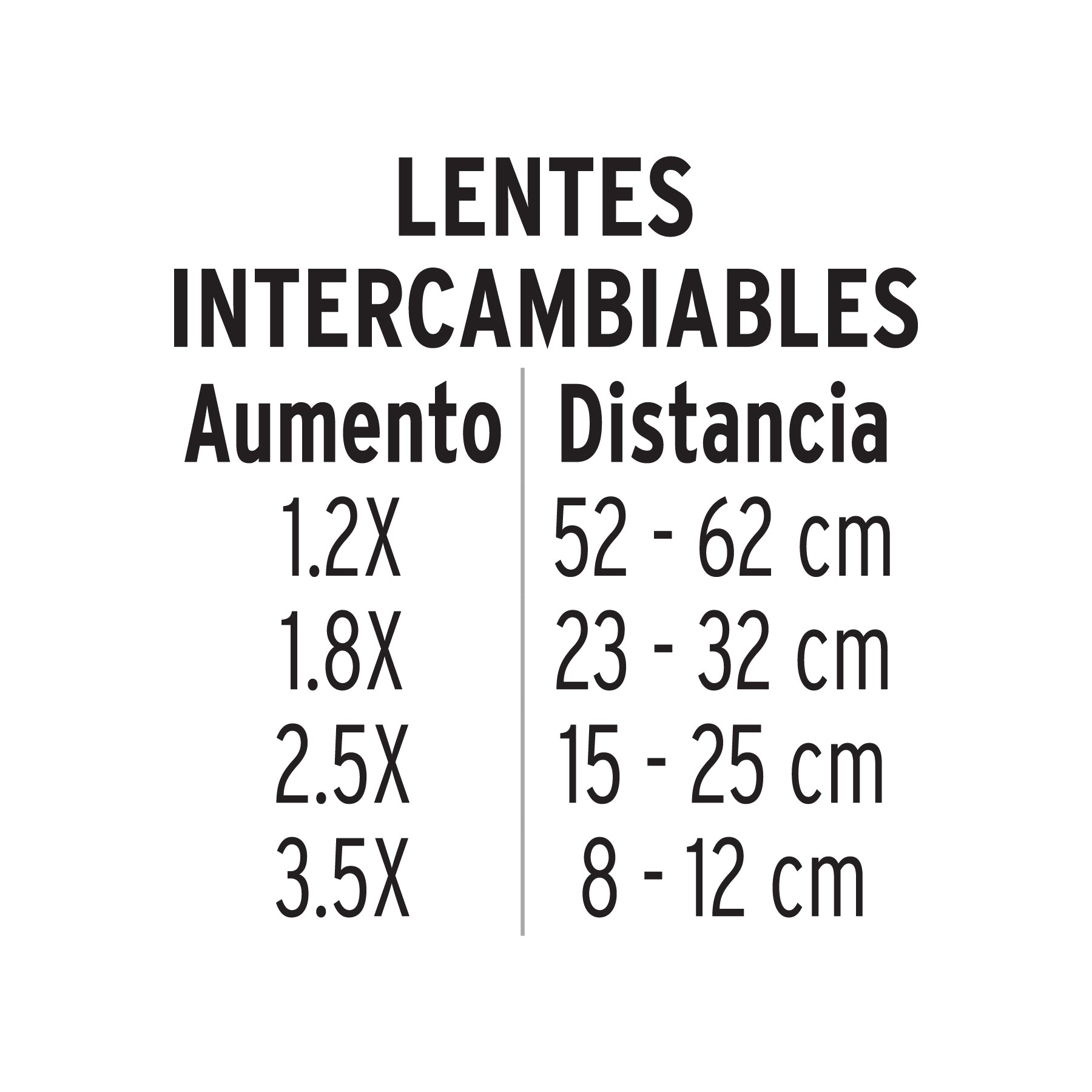 - Lente con aumento 1.2X con distancia de 52-62 cm.