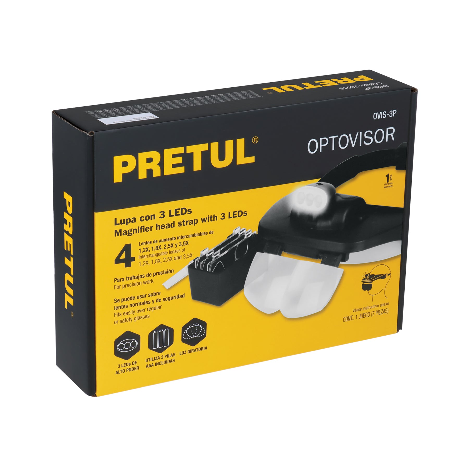 La lupa Optovisor Pretul es ideal para trabajos de precisión con manos libres, como electrónica, joyería o manualidades.Está fabricada en ABS y cuenta con una banda ajustable que brinda mayor comodidad durante el uso.