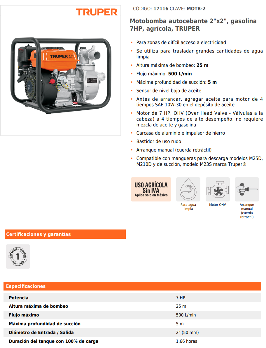 Cuenta con carcasa de aluminio, impulsor de hierro, bastidor de uso rudo, arranque manual con cuerda retráctil y sensor de nivel bajo de aceite. Es compatible con mangueras de descarga modelos M25D, M210D y de succión modelo M23S de Truper®. Antes de usar, agregar aceite SAE 10W-30 para motor de 4 tiempos.
