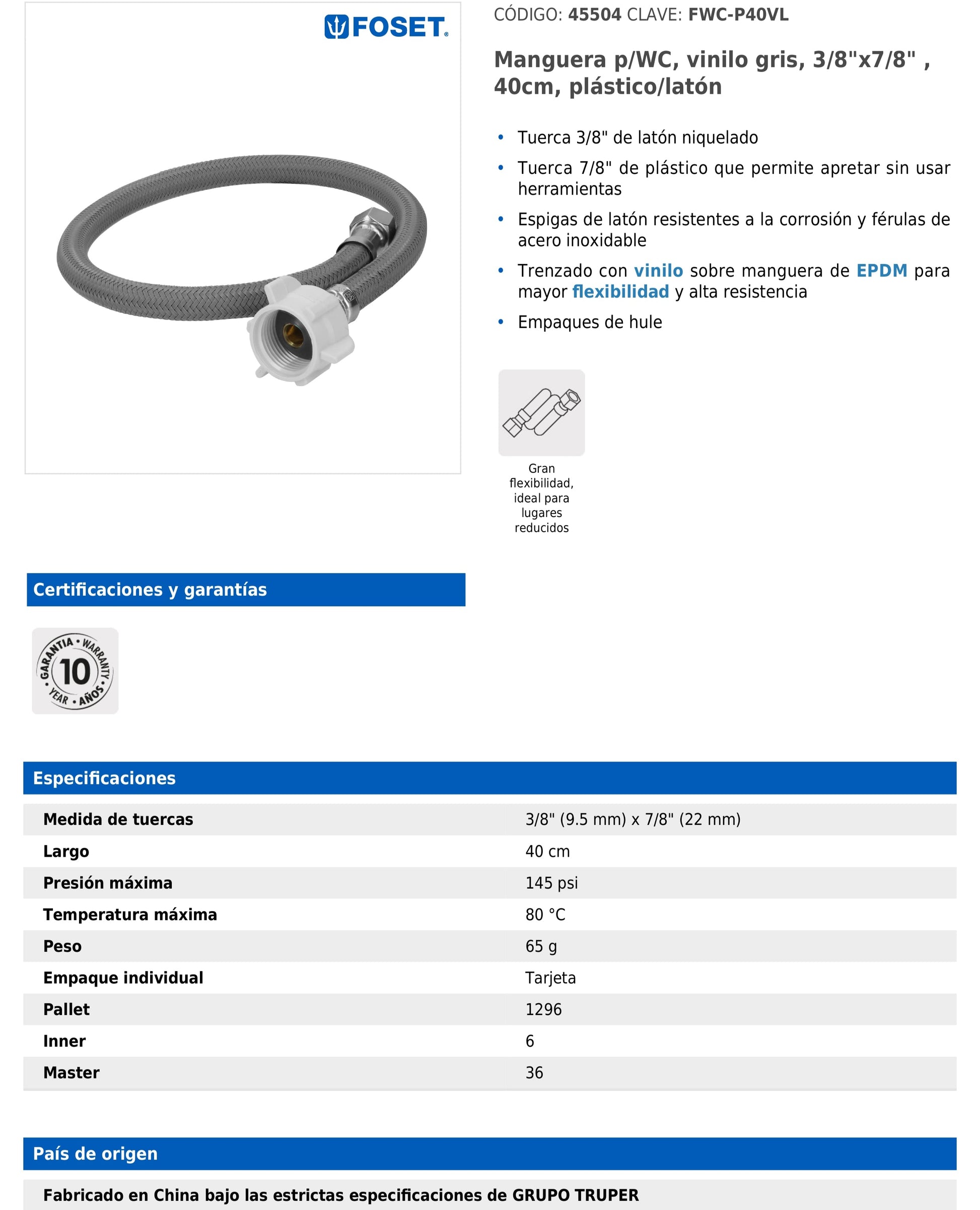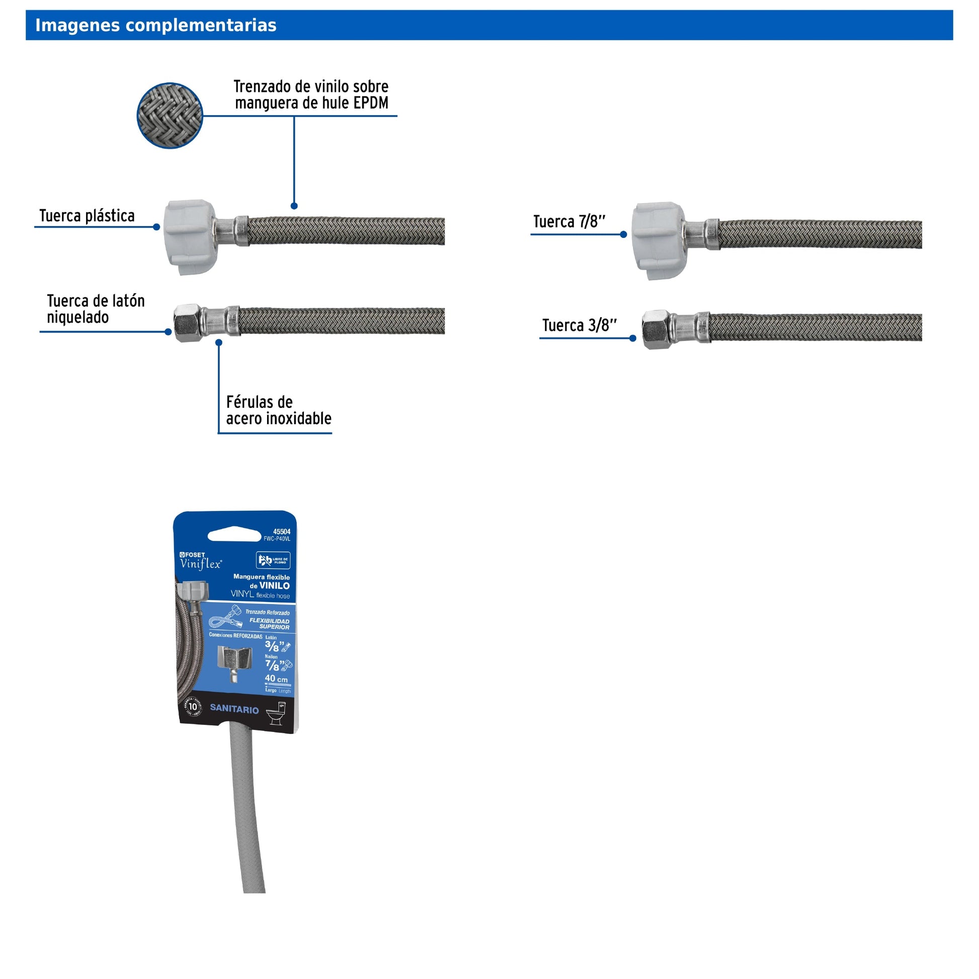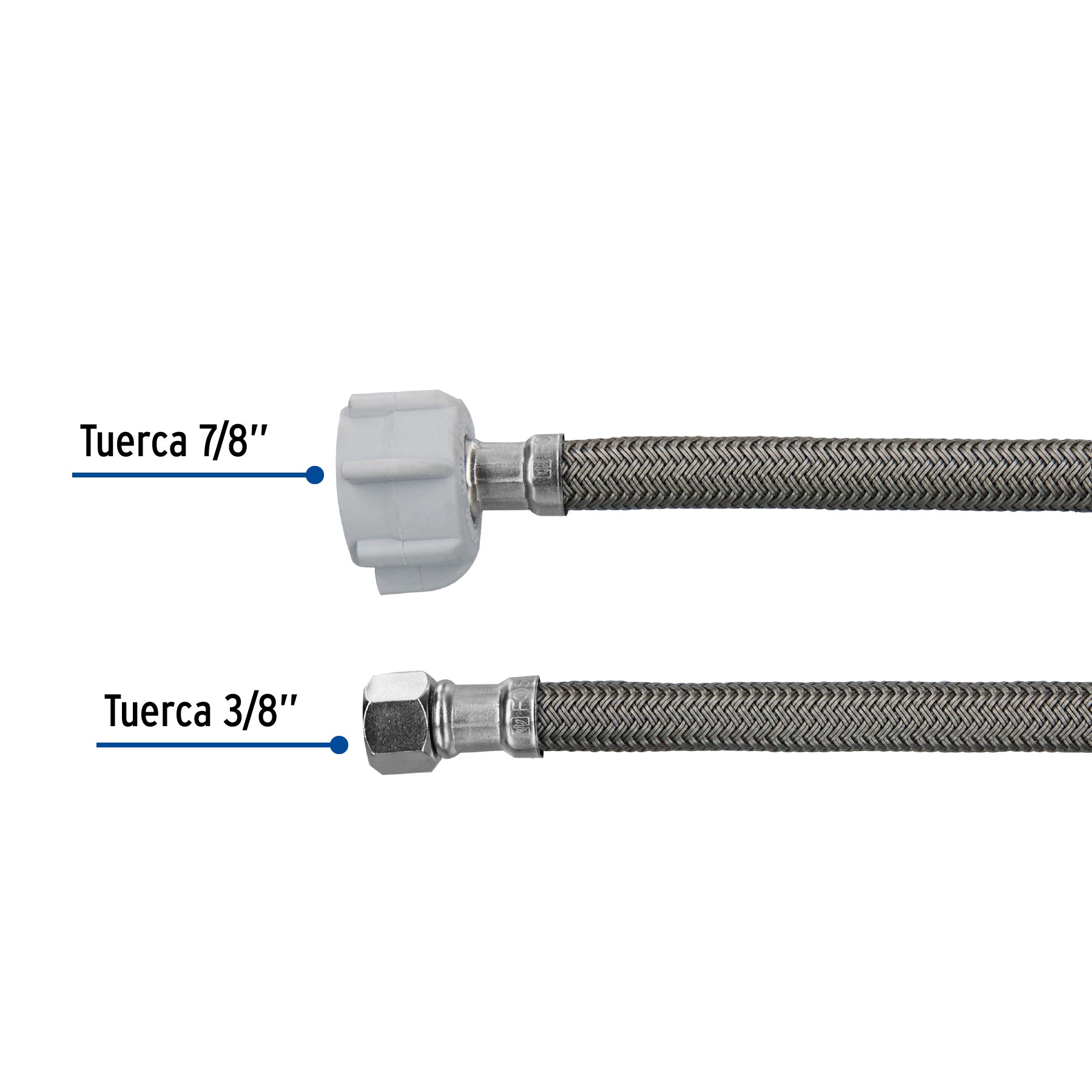 Fabricada con tuerca plástica de 7/8" que permite apretar sin herramientas y tuerca de latón niquelado de 3/8". Su estructura cuenta con espigas de latón, férulas de acero inoxidable y trenzado de vinilo sobre hule EPDM. Alta flexibilidad, ideal para espacios reducidos.