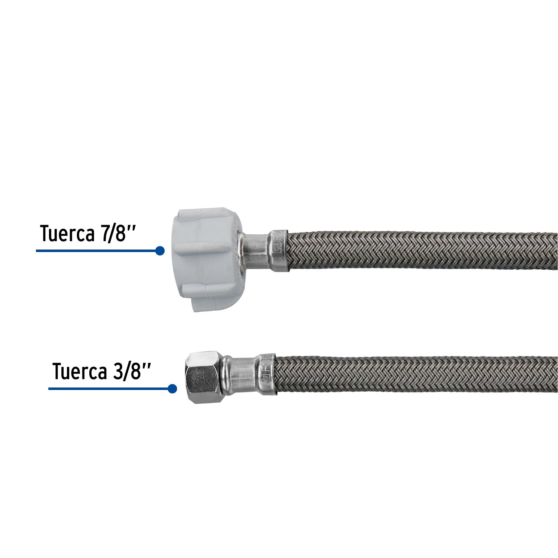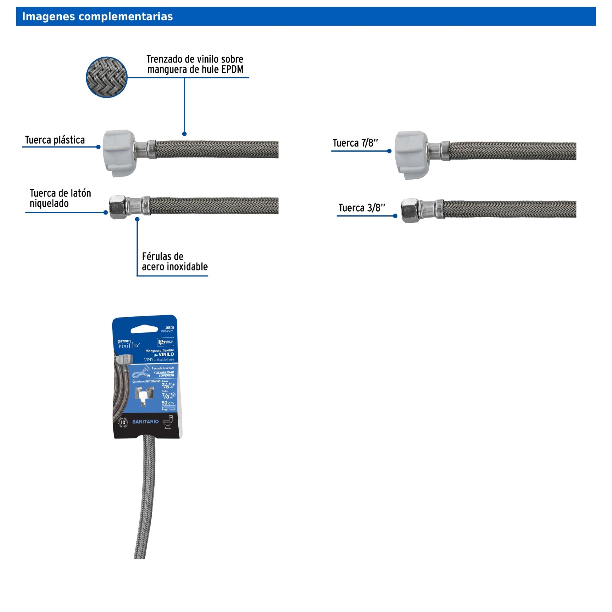 Diseñada con tuerca plástica de 7/8" que permite apretar sin herramientas y tuerca de latón niquelado de 3/8". Incluye espigas de latón resistentes a la corrosión, férulas de acero inoxidable y trenzado con vinilo sobre manguera de EPDM. Gran flexibilidad, ideal para espacios reducidos.