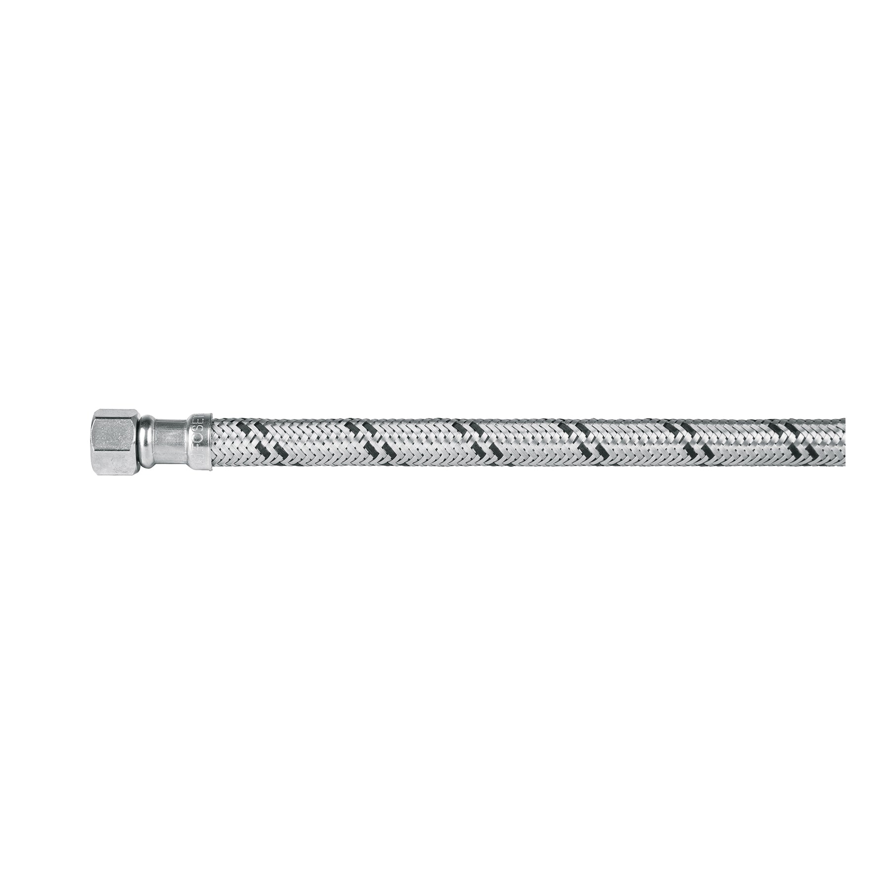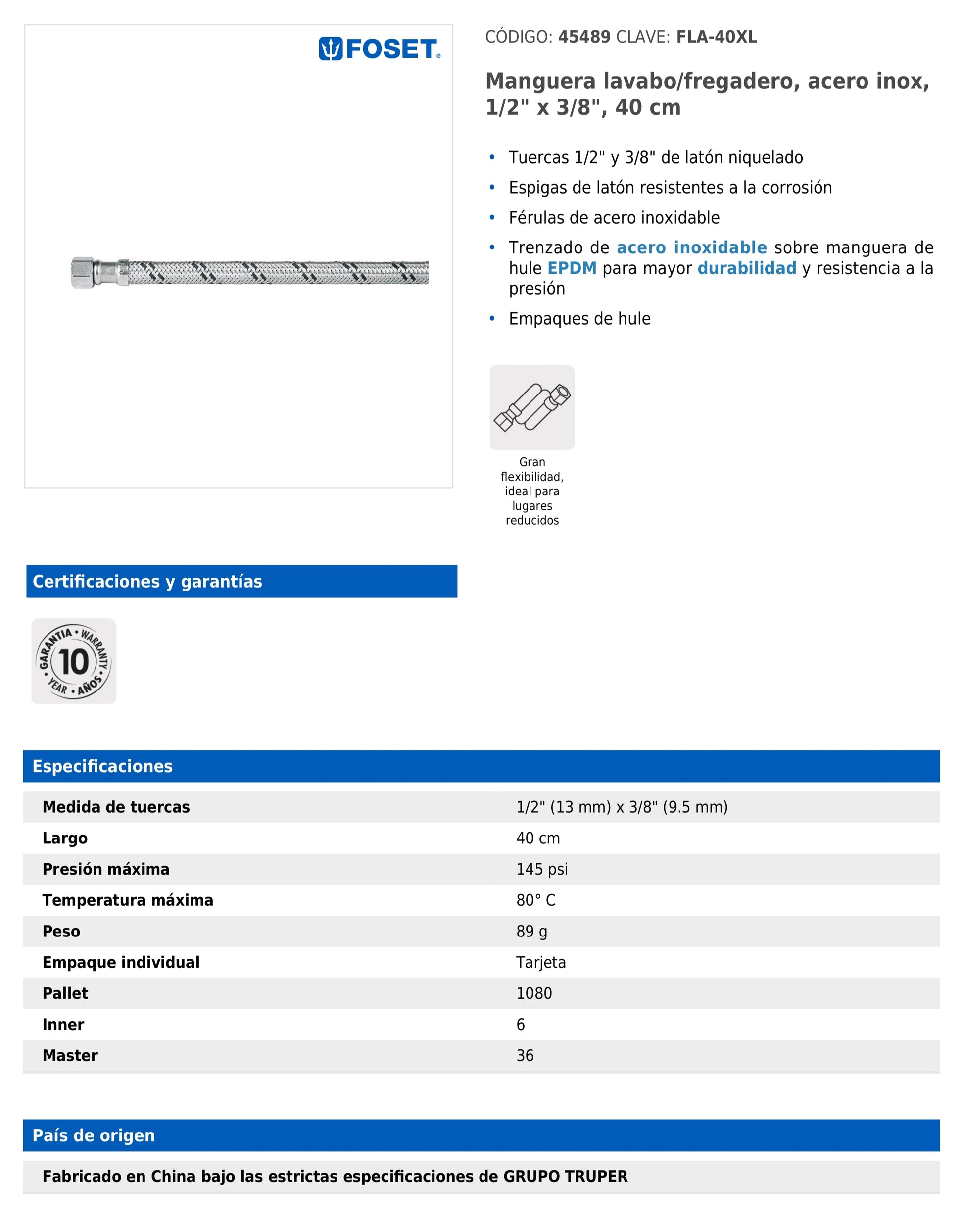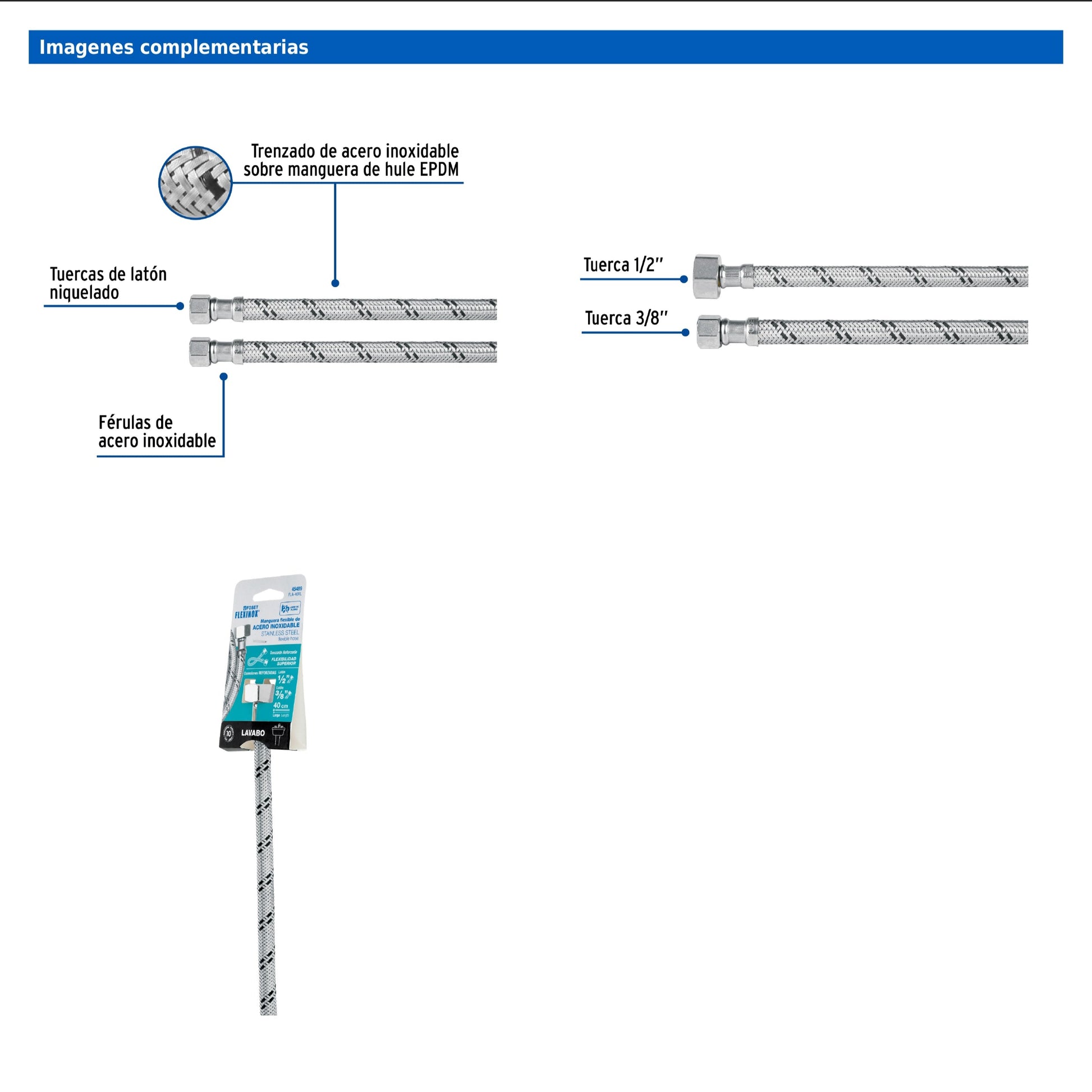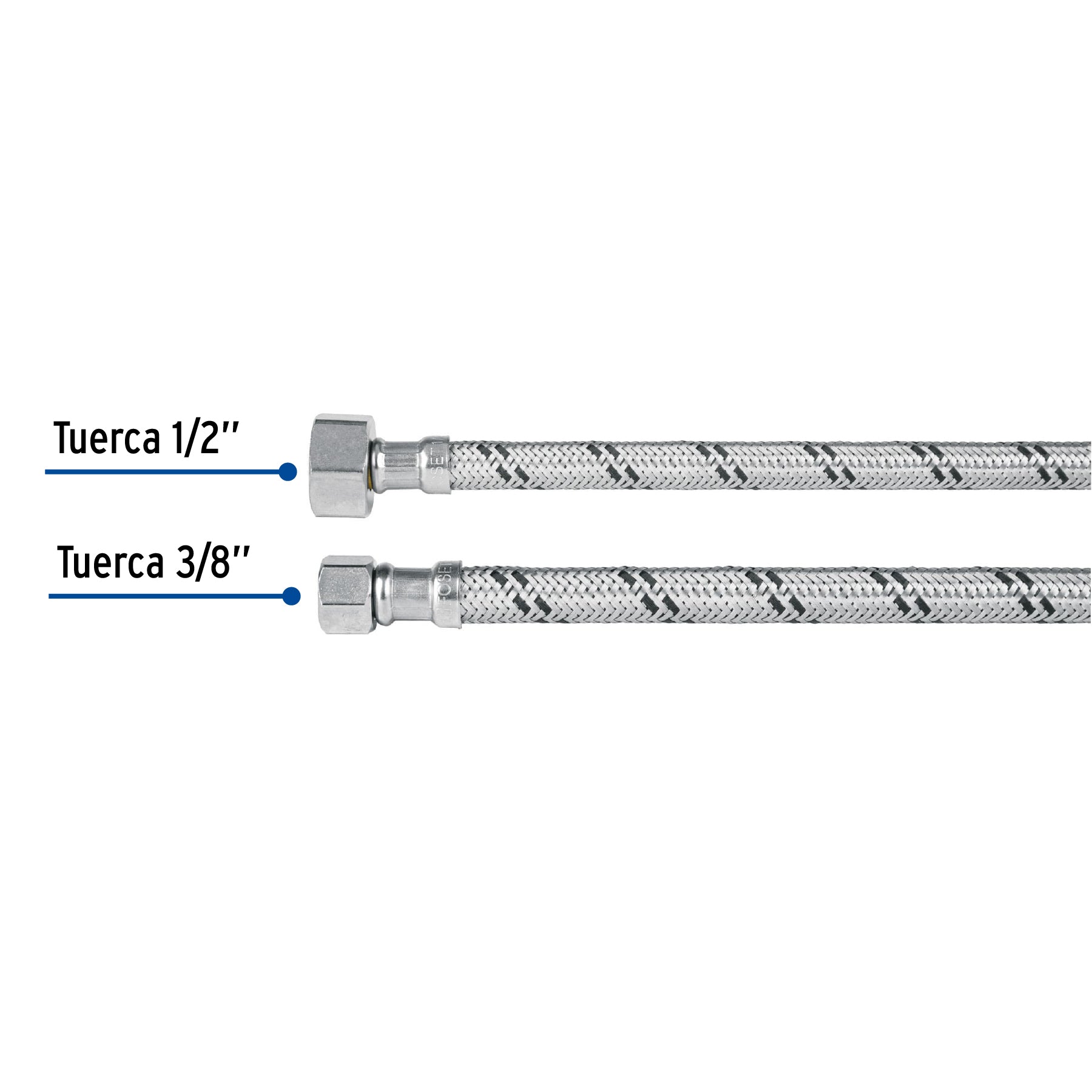 Equipada con tuercas de latón niquelado de 1/2" y 3/8", espigas resistentes a la corrosión y férulas de acero inoxidable. Su trenzado de acero sobre hule EPDM proporciona gran durabilidad y resistencia a la presión. Incluye empaques de hule. Ideal para espacios reducidos.