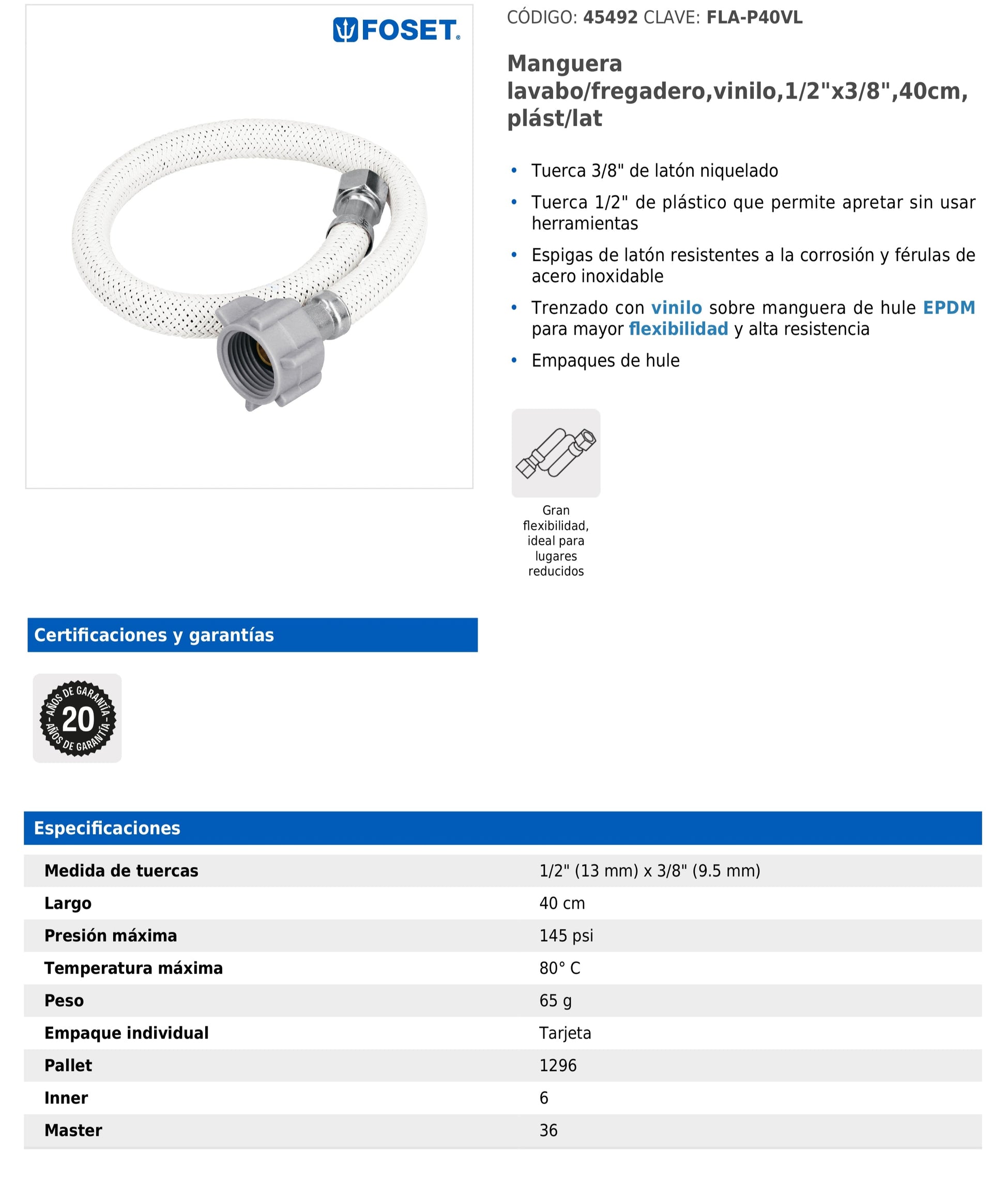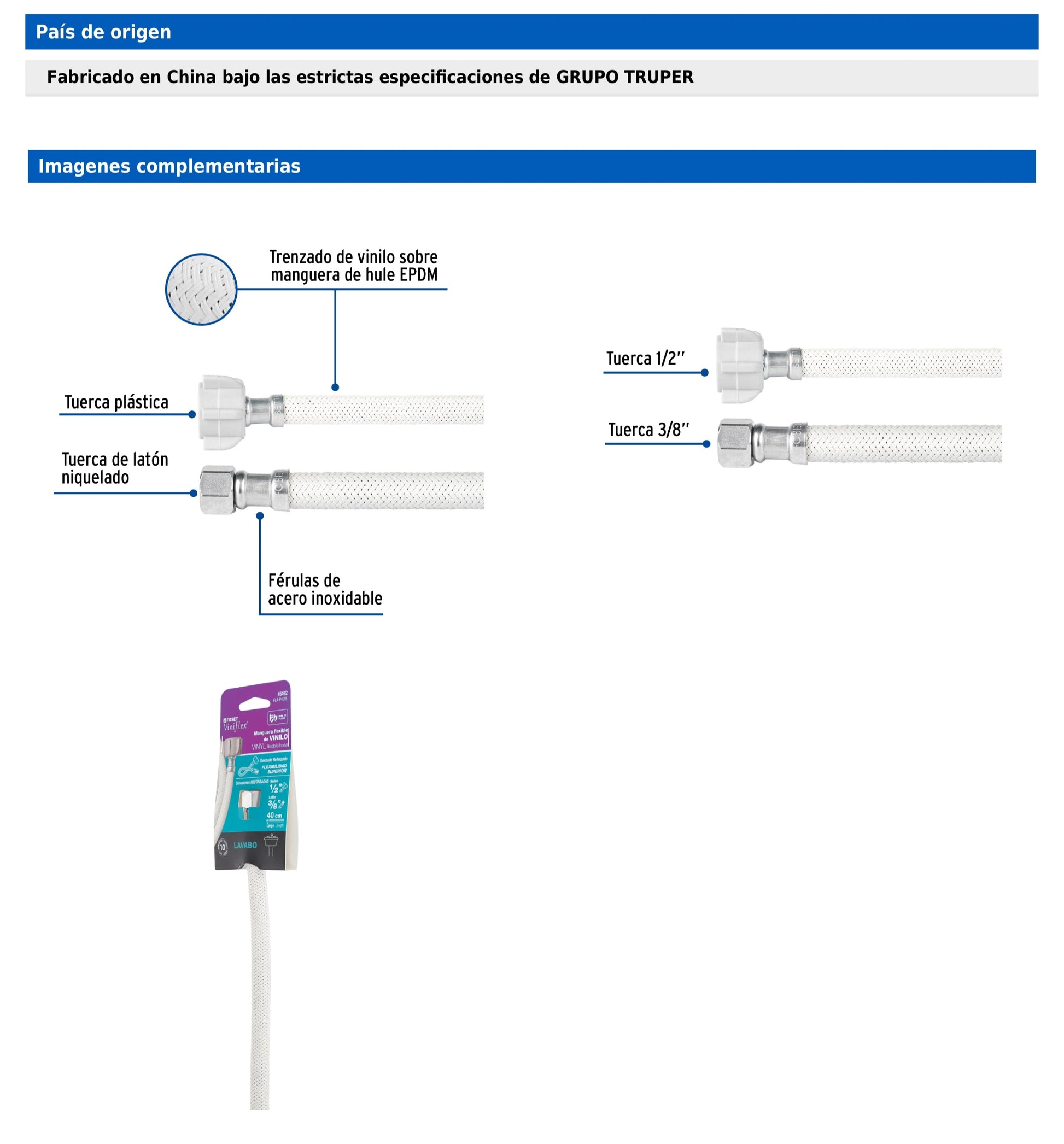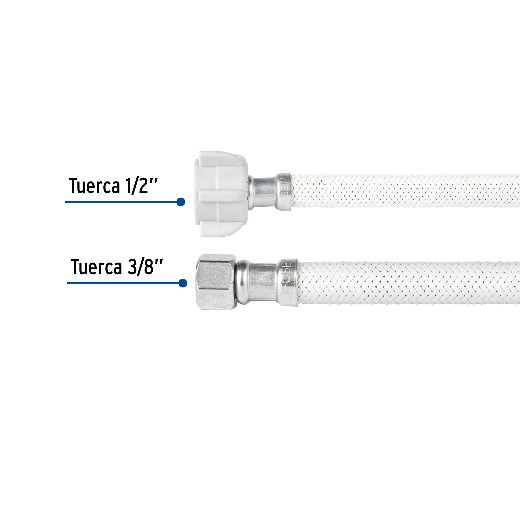 Cuenta con tuerca plástica de 1/2" que permite apretar sin herramientas y tuerca de latón niquelado de 3/8". Sus espigas de latón, férulas de acero inoxidable y trenzado con vinilo sobre manguera de hule EPDM le otorgan flexibilidad y resistencia. Incluye empaques de hule. Ideal para espacios reducidos.