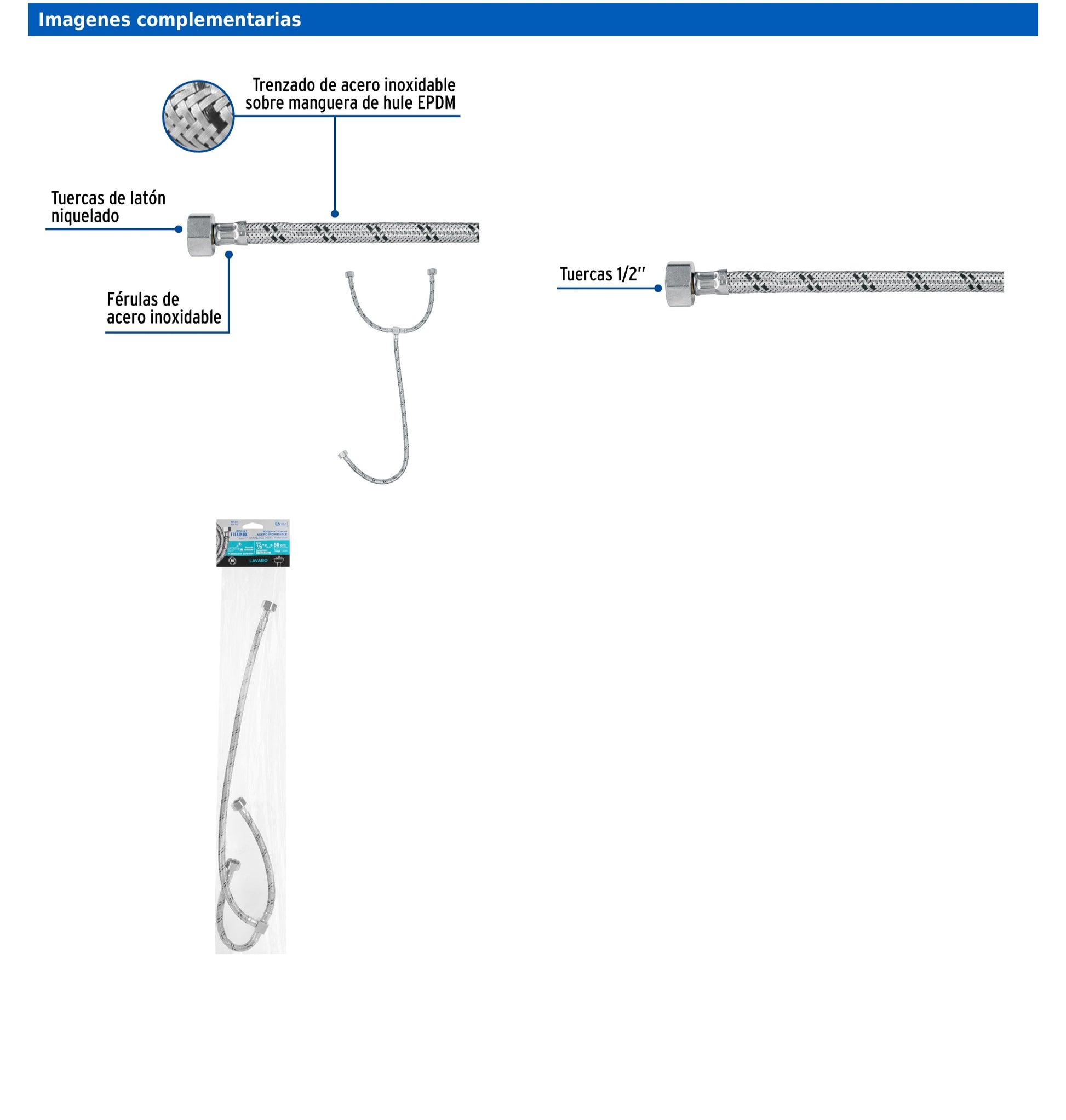 Cuenta con tuercas de latón niquelado de 1/2", espigas de latón resistentes a la corrosión, férulas de acero inoxidable y trenzado sobre manguera de hule EPDM para mayor resistencia a la presión. Incluye empaques de hule. Su gran flexibilidad la hace ideal para lugares reducidos.
