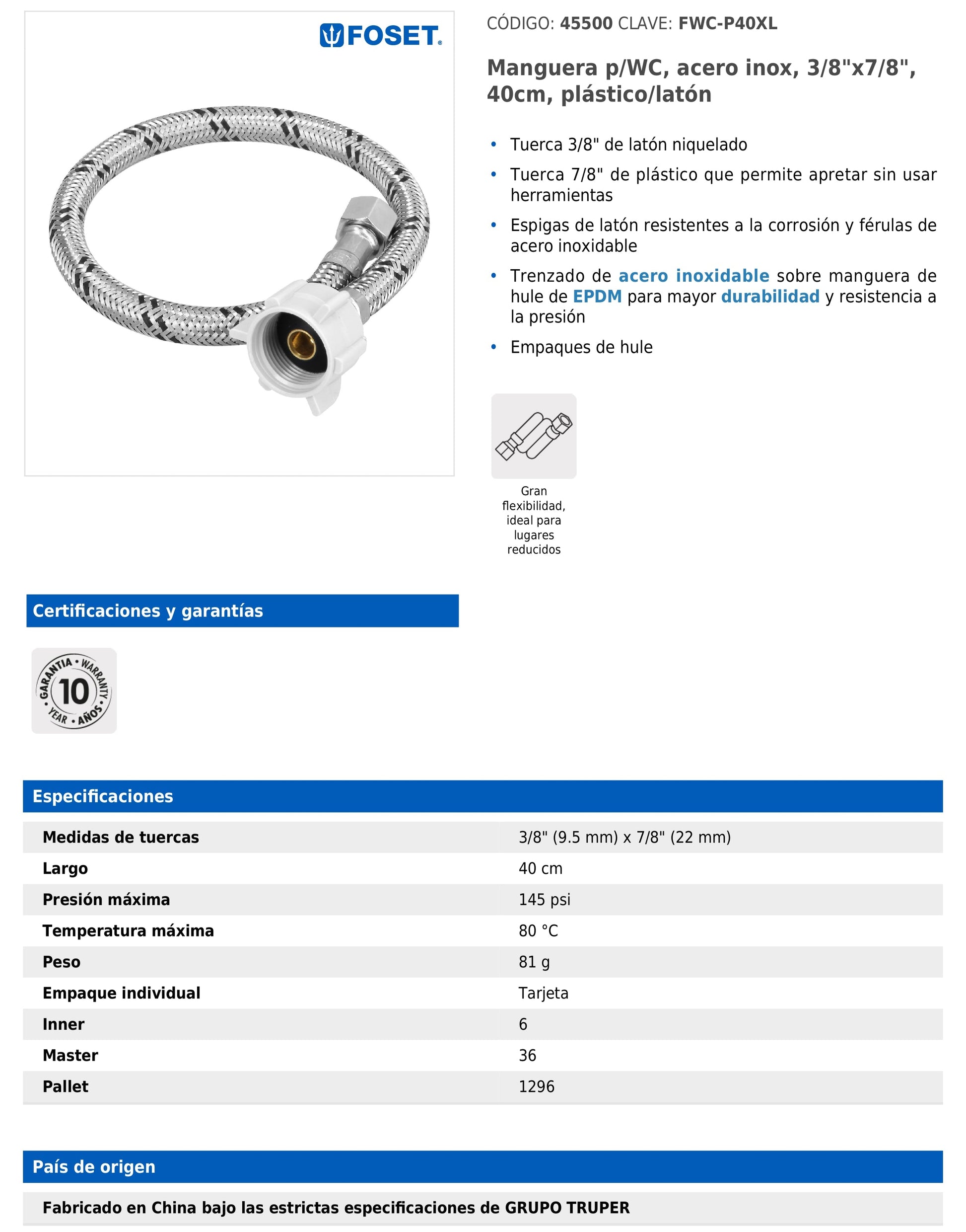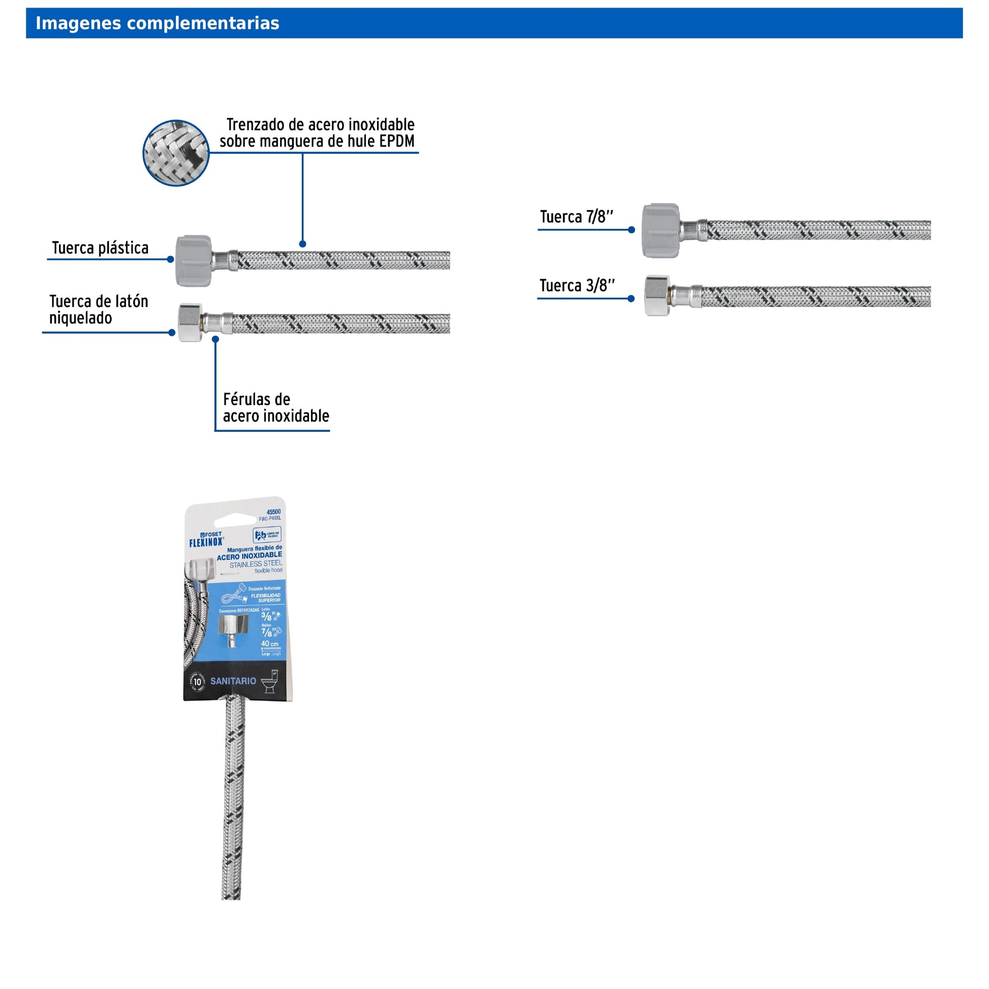 Incluye tuerca plástica de 7/8" que permite apretar sin herramientas y tuerca de latón niquelado de 3/8". Construida con espigas de latón, férulas de acero inoxidable y trenzado en acero sobre manguera de hule EPDM. Alta resistencia, ideal para instalaciones en espacios reducidos.