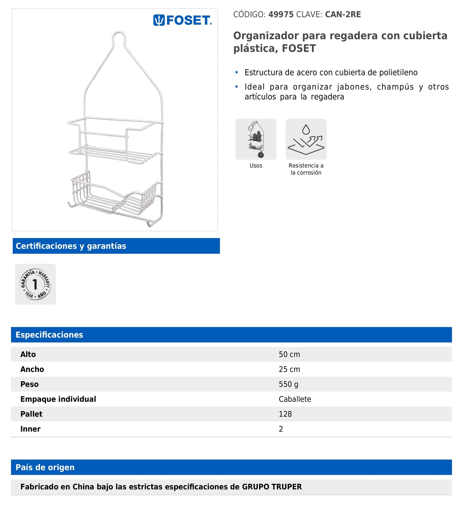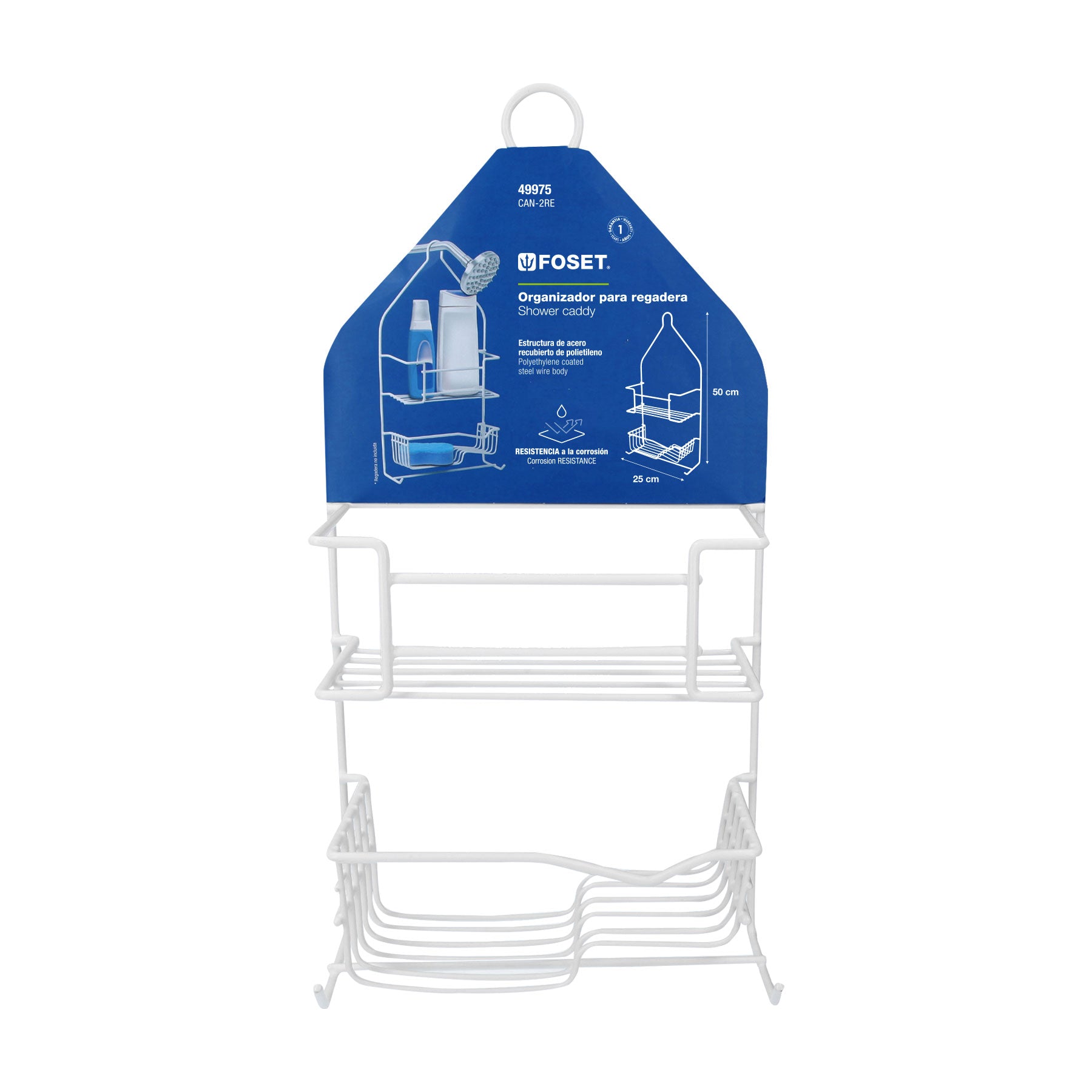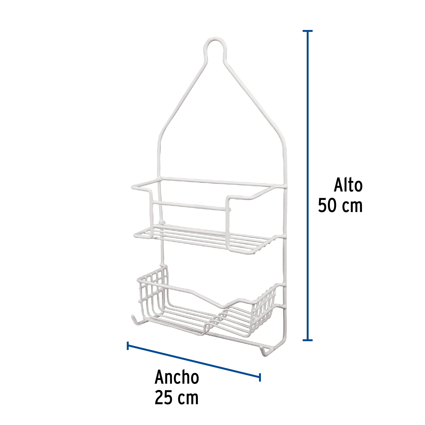 Diseñado para organizar jabones, champús y otros artículos de baño. Su estructura de acero con recubrimiento de polietileno ofrece buena resistencia a la corrosión. Ideal para mantener el área de regadera limpia y ordenada.