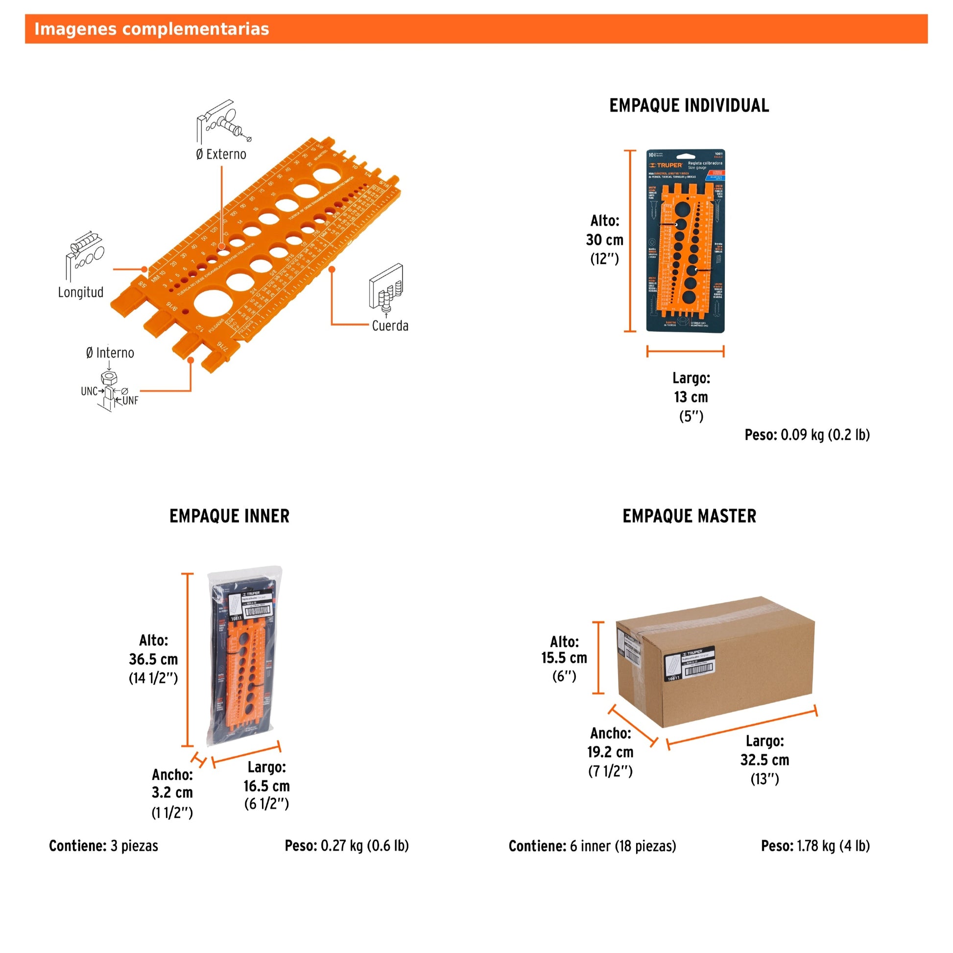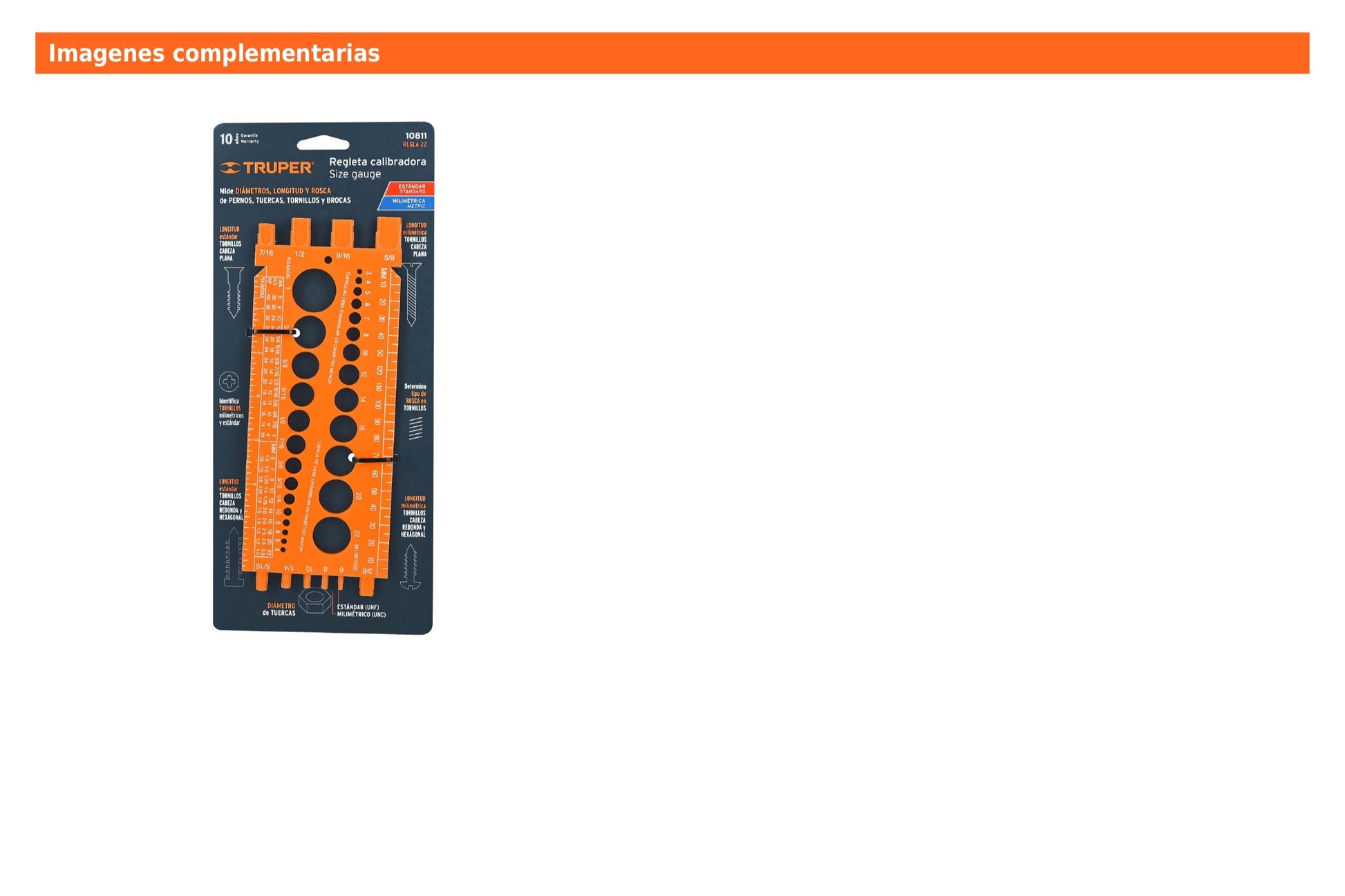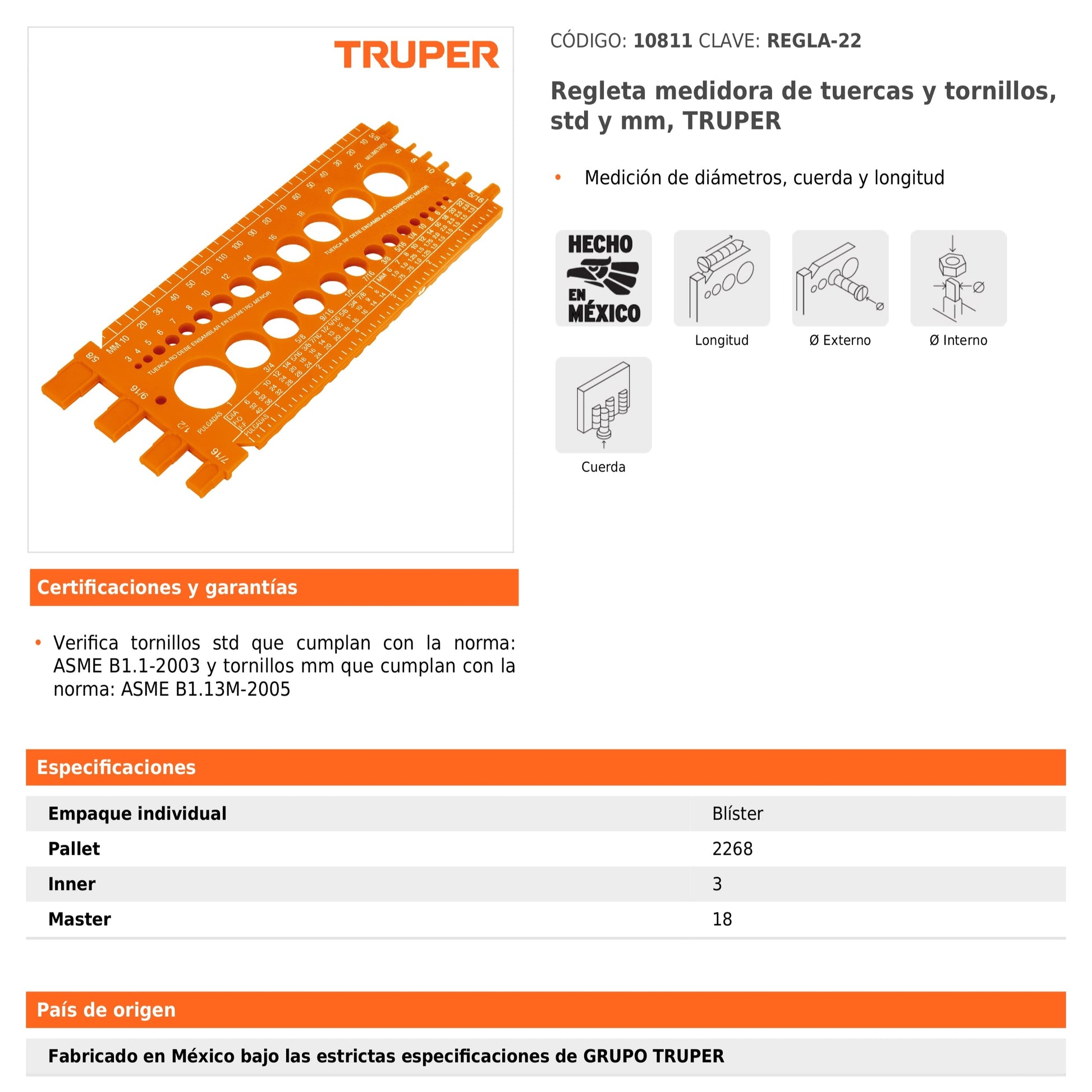 Regleta Truper para medir diámetros, cuerda y longitud de tuercas y tornillos en formatos estándar y milimétrico. Verifica cumplimiento con normas ASME B1.1-2003 y ASME B1.13M-2005, asegurando precisión en trabajos mecánicos y de ajuste.