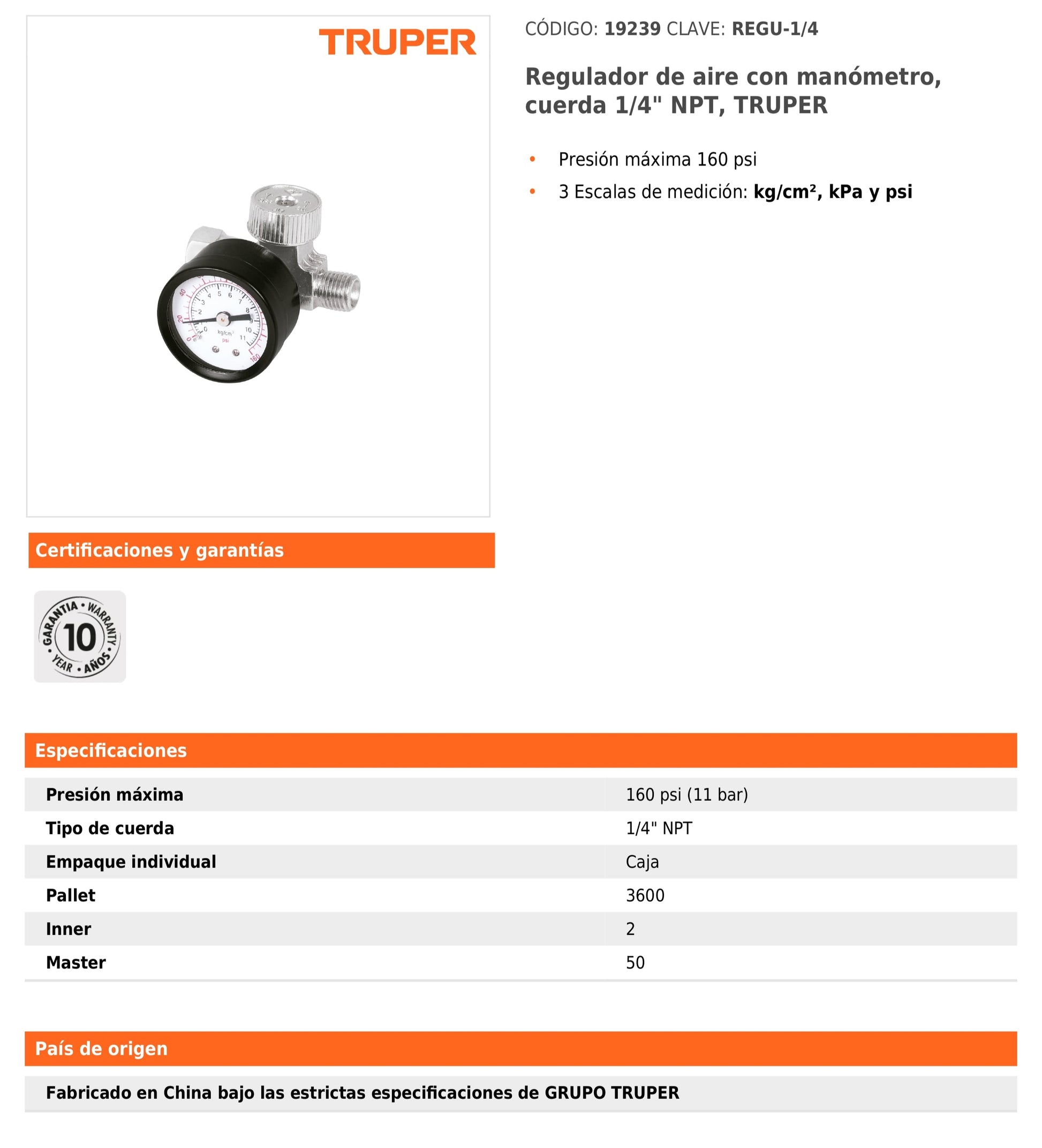 Este regulador de aire Truper cuenta con manómetro integrado y cuerda de 1/4" NPT. Soporta hasta 160 psi e incluye 3 escalas de medición: kg/cm², kPa y psi. Ideal para equipos neumáticos que requieren control preciso de presión de aire.