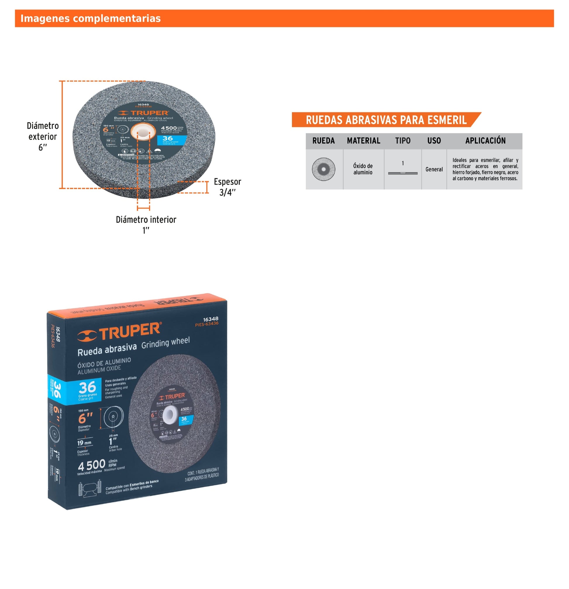 Esta rueda abrasiva Truper de 6" x 3/4" está fabricada en óxido de aluminio, ideal para afilar, rectificar y esmerilar aceros en general, hierro forjado y materiales ferrosos.