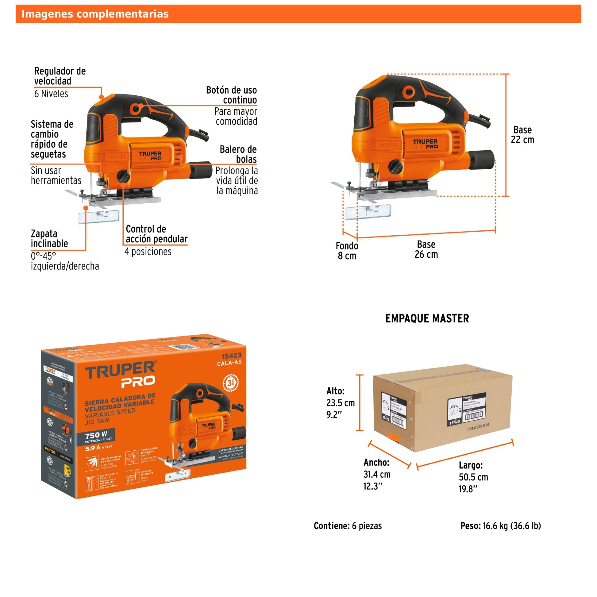 Sierra caladora Truper PRO de 750 W con motor montado sobre balero de bolas para mayor vida útil. Incluye regulador de velocidad variable en 6 niveles, acción pendular de 4 posiciones y zapata inclinable hasta 45° en ambos lados.